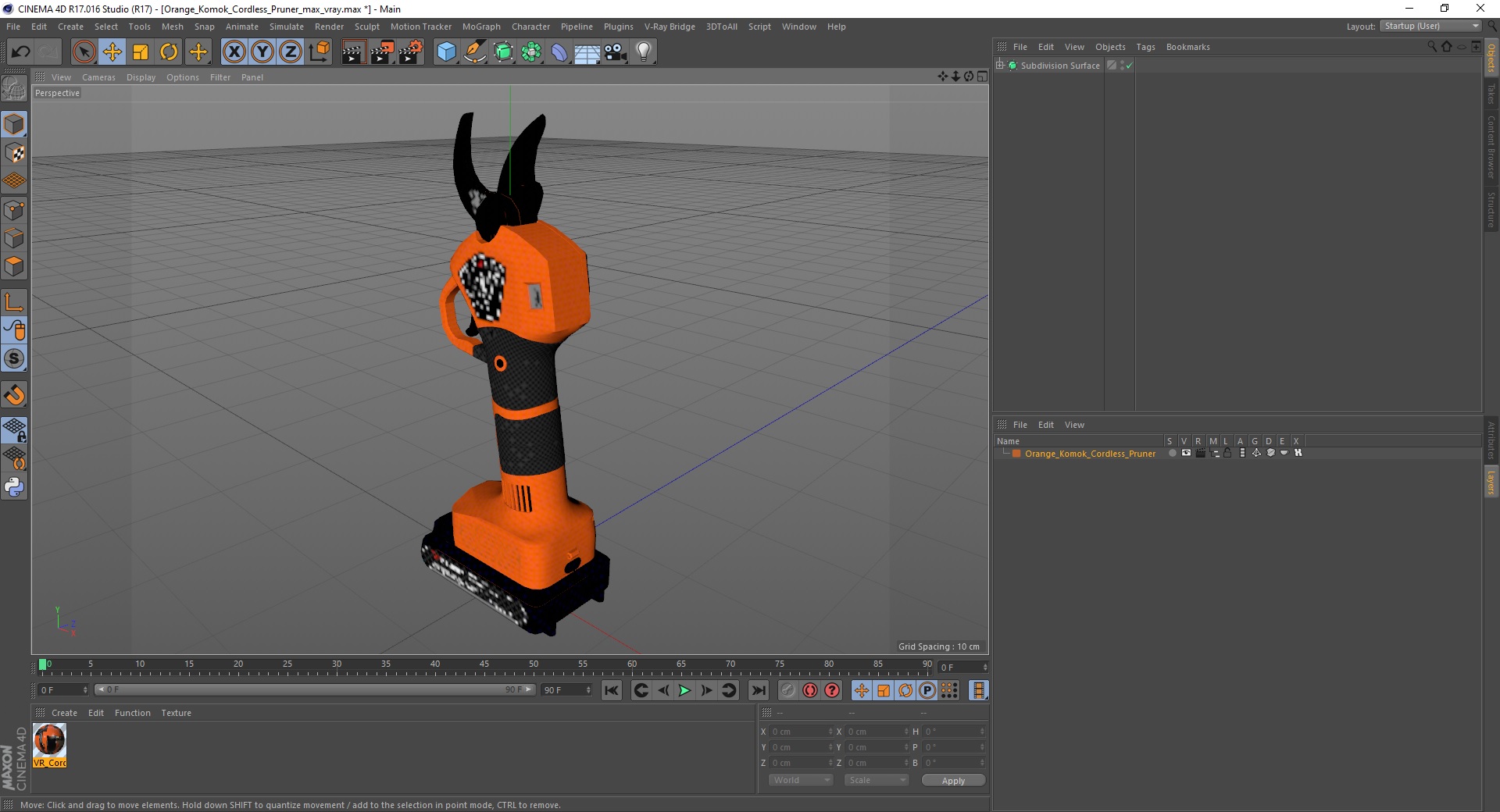 Orange Komok Cordless Pruner is a high quality, photo real 3d model that will enhance detail and realism to any of your rendering projects. The model has a fully textured, detailed design that allows for close-up renders, and was originally modeled in 3ds Max 2020 and rendered with V-Ray. Renders have no postprocessing!