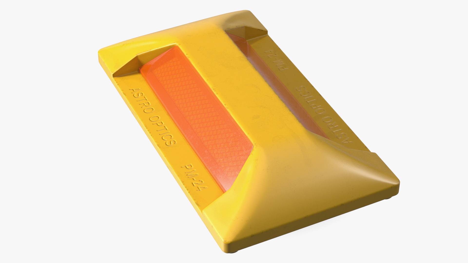 Orange Reflective Road Stud is a 3D model of raised reflective road pavement marker with specialized stud (pin or peg) that is a small, raised object placed on roads to help drivers stay within their lanes.