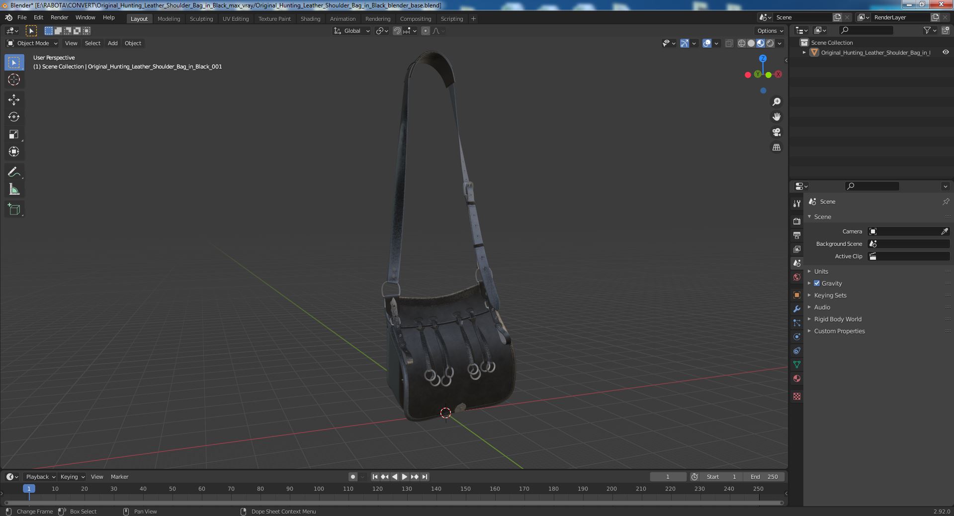 Original Hunting Leather Shoulder Bag in Black is a high quality, photo real 3d model that will enhance detail and realism to any of your rendering projects. The model has a fully textured, detailed design that allows for close-up renders, and was originally modeled in 3ds Max 2020 and rendered with V-Ray. Renders have no postprocessing!