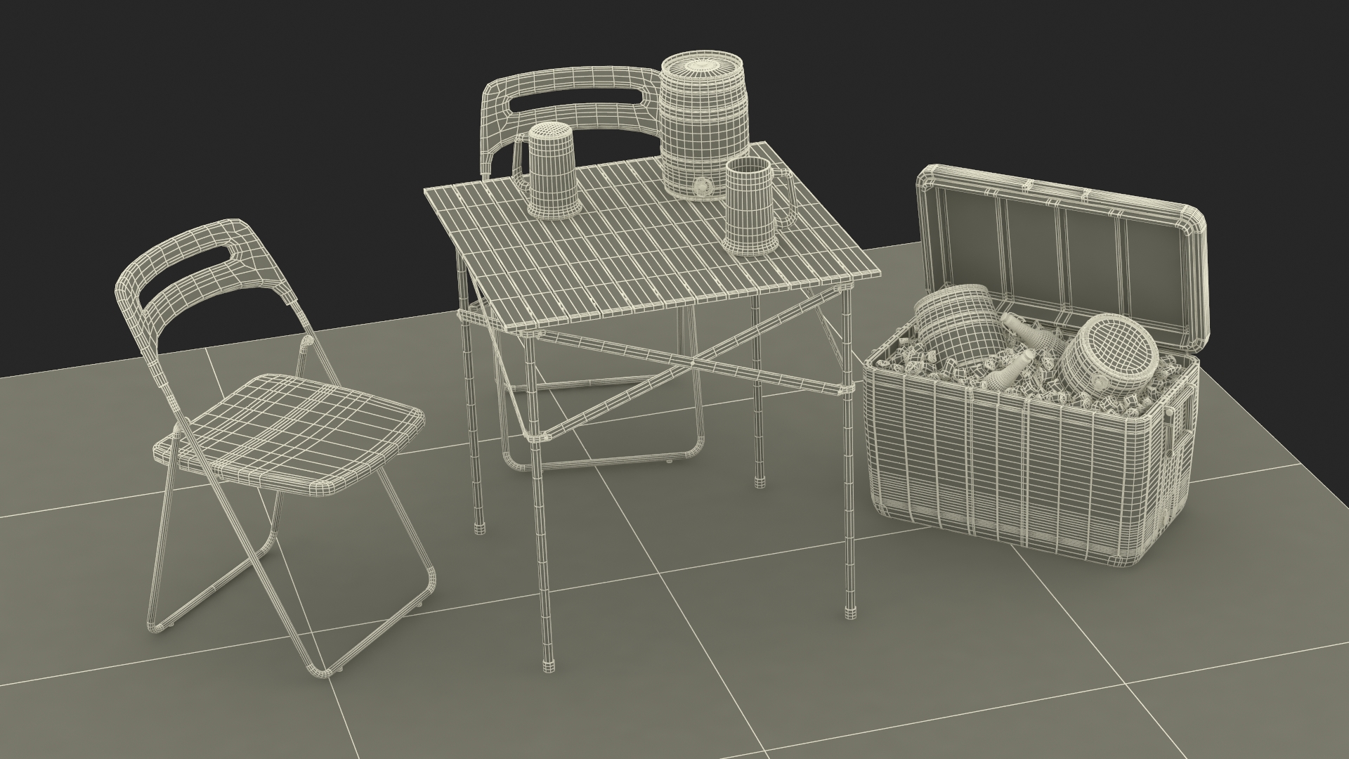 Outdoor Picnic Set with Folding Table Chairs and Cooler with Fur is a three-dimensional model of outdoor picnic set with folding table, foldable chairs, pair of beer mug and type ice cooler (ice box) with beer barrel.