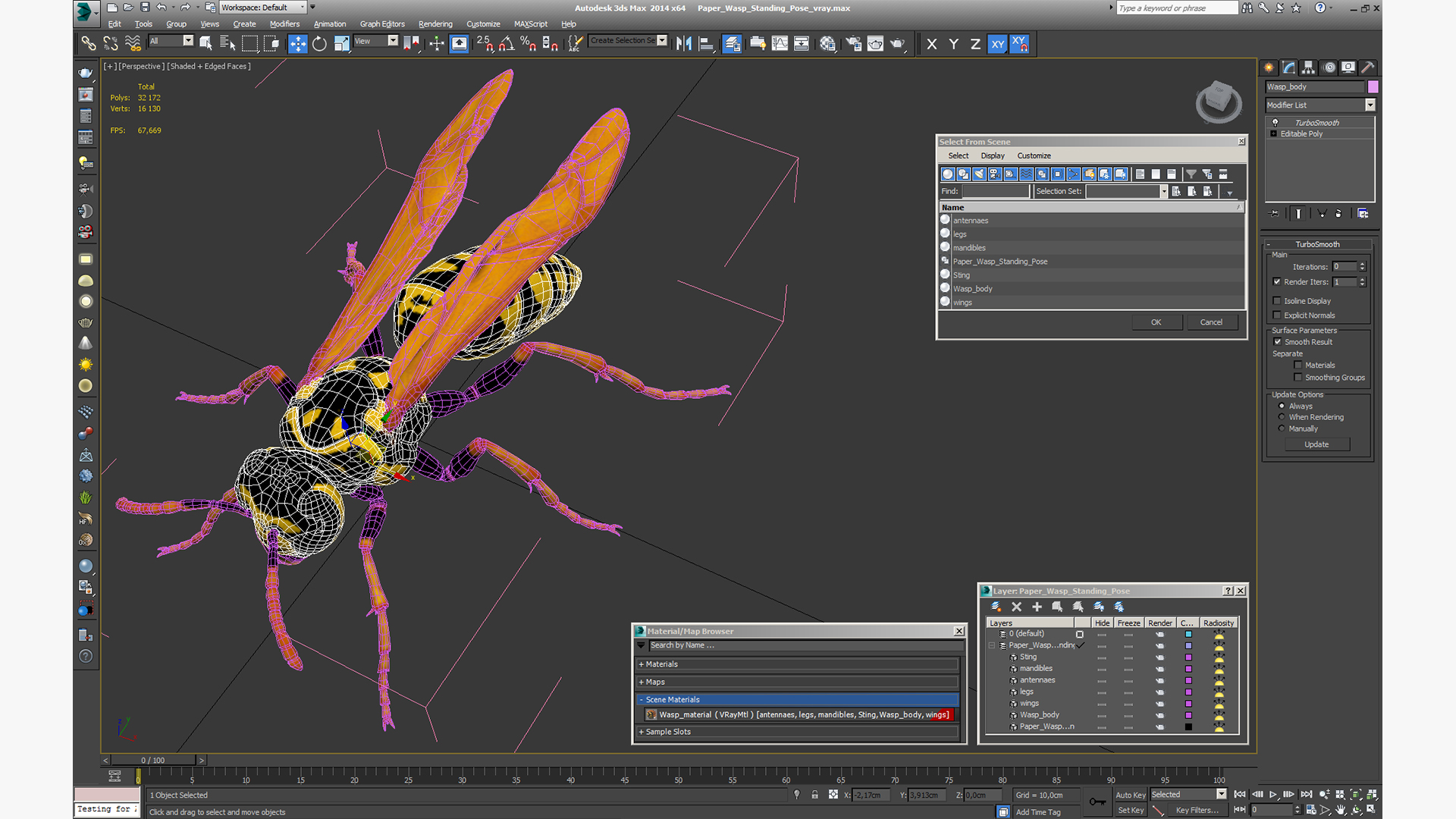 Paper Wasp Standing Pose is a high quality, photo real 3d model that will enhance detail and realism to any of your rendering projects. The model has a fully textured, detailed design that allows for close-up renders, and was originally modeled in 3ds Max 2020 and rendered with V-Ray. Renders have no postprocessing!
