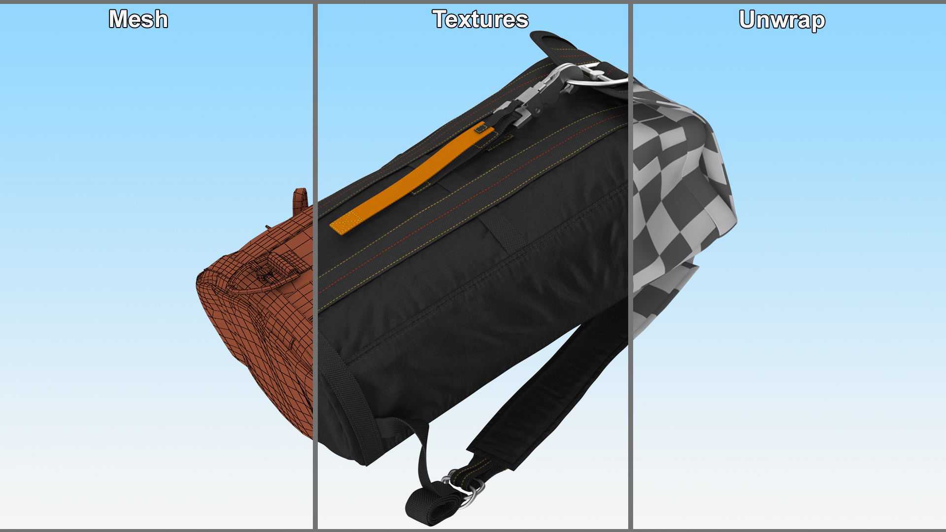 Parachute Pack Travel Backpack Black is a high quality, photo real 3d model that will enhance detail and realism to any of your rendering projects. The model has a fully textured, detailed design that allows for close-up renders, and was originally modeled in 3ds Max 2020 and rendered with V-Ray. Renders have no postprocessing!