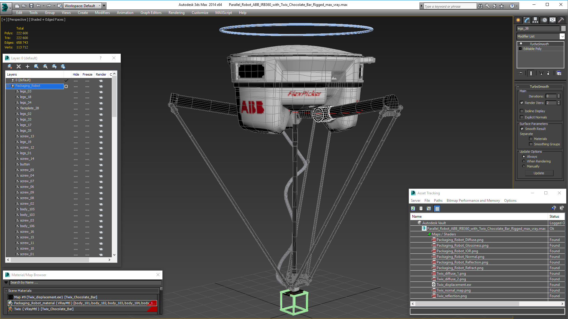 Parallel Robot ABB IRB360 with Twix Chocolate Bar Rigged is fully rigged and is ready to be animated. You can easily position it the way you need or animate it the way your project requires using helpers in 3D Studio Max. See the turntable to get an idea of how rigging works.