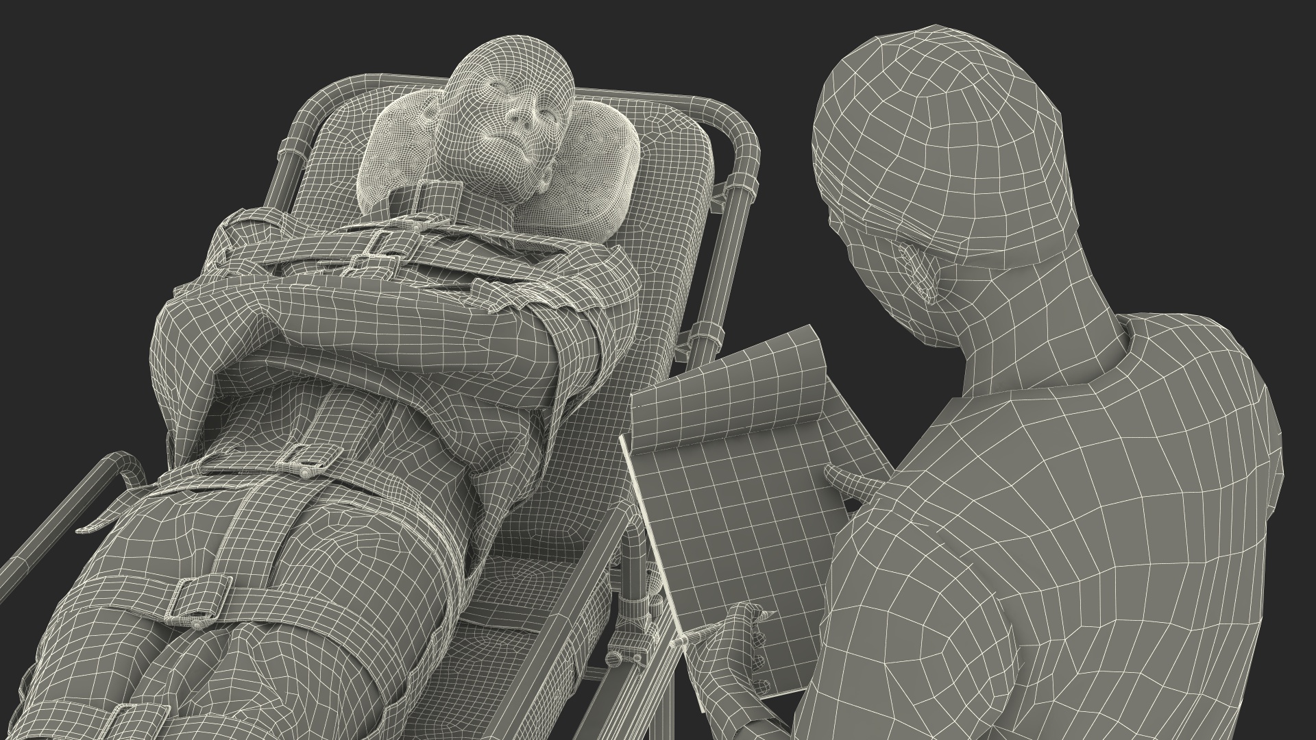 Paramedic with Patient in Straitjacket on Stretcher is a high quality, photo real 3d model that will enhance detail and realism to any of your rendering projects. The model has a fully textured, detailed design that allows for close-up renders, and was originally modeled in 3ds Max 2020 and rendered with V-Ray. Renders have no postprocessing!