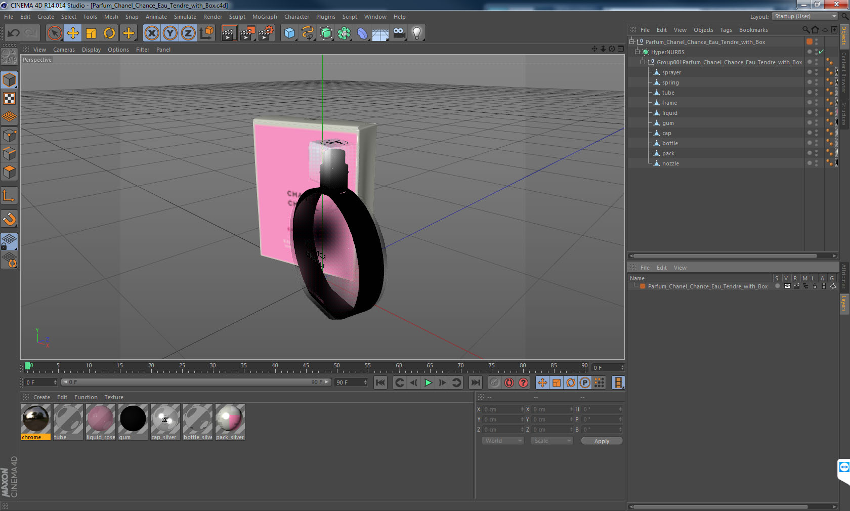 Parfum Chanel Chance Eau Tendre with Box is a high quality, photo real 3d model that will enhance detail and realism to any of your rendering projects. The model has a fully textured, detailed design that allows for close-up renders, and was originally modeled in 3ds Max 2020 and rendered with V-Ray. Renders have no postprocessing!