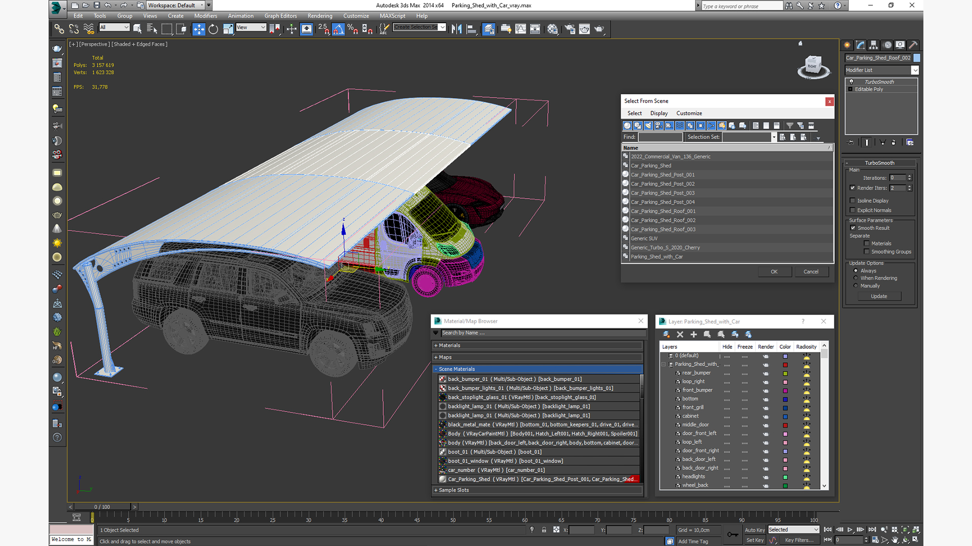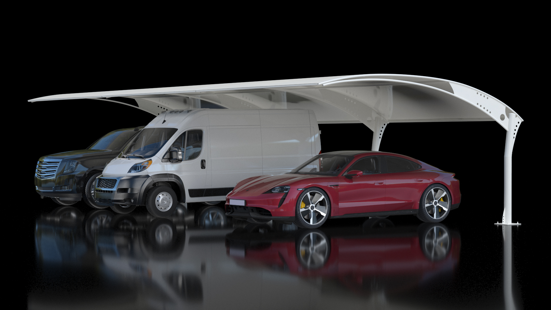 Parking Shed with Car is a three-dimensional model of a widespread canoped area with cars and van, which intended for parking vehicles.