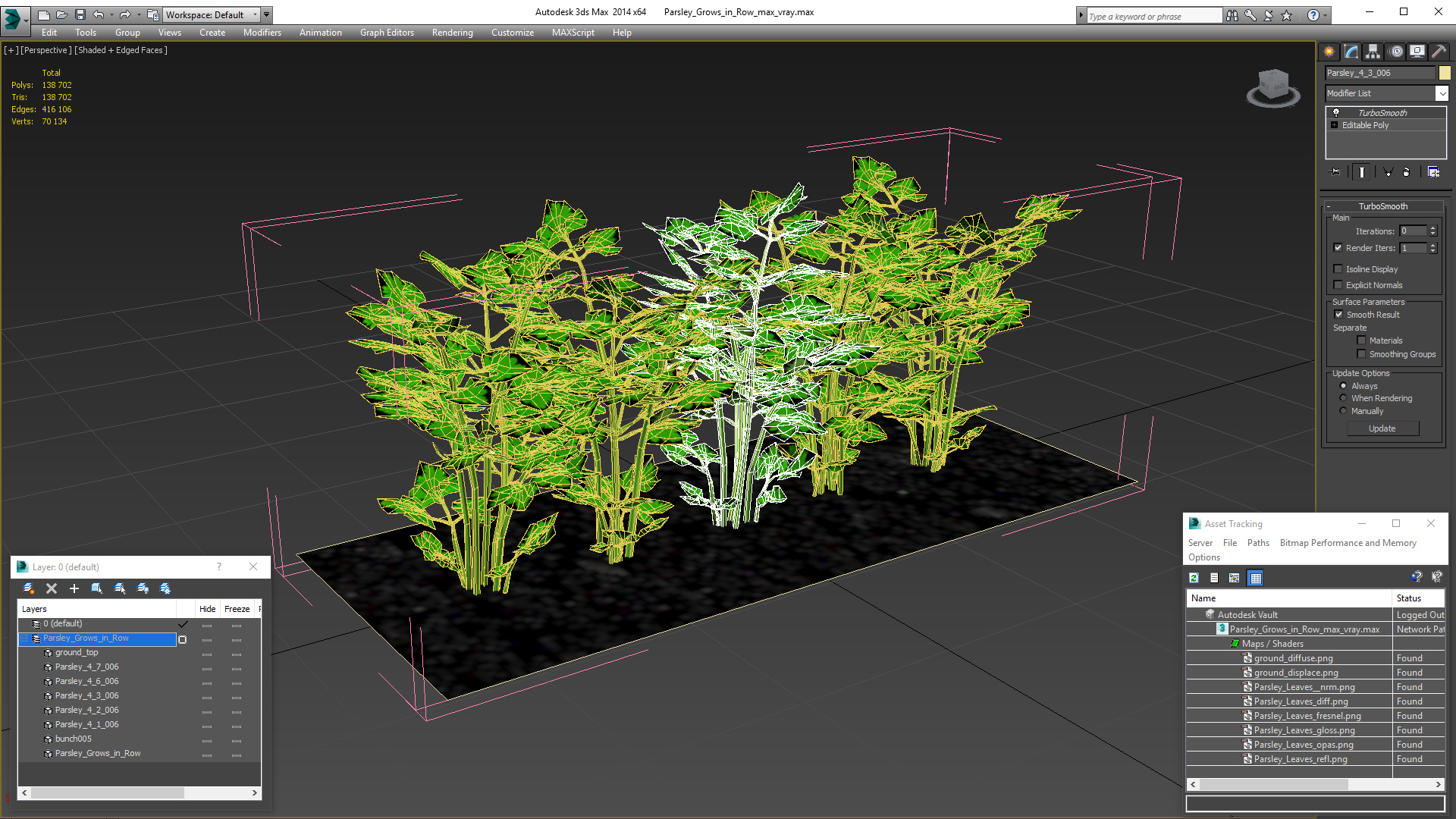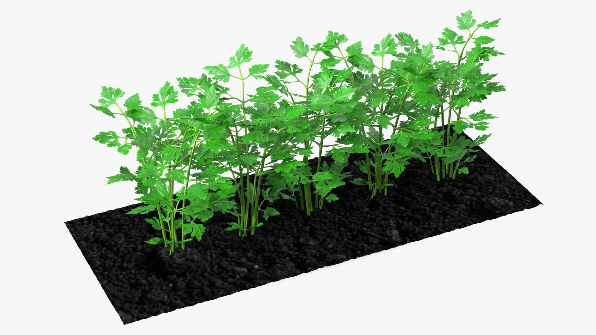 Parsley Grows in Row is a three-dimensional model of a soil bed with green parsley plant which consumed as a food garnish.