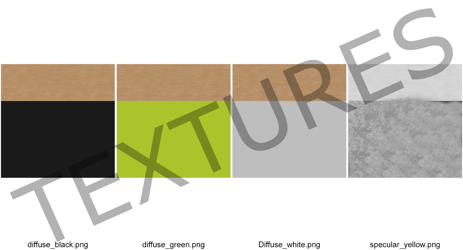 All textures and materials are included and mapped. (All colors can be easily modified.)