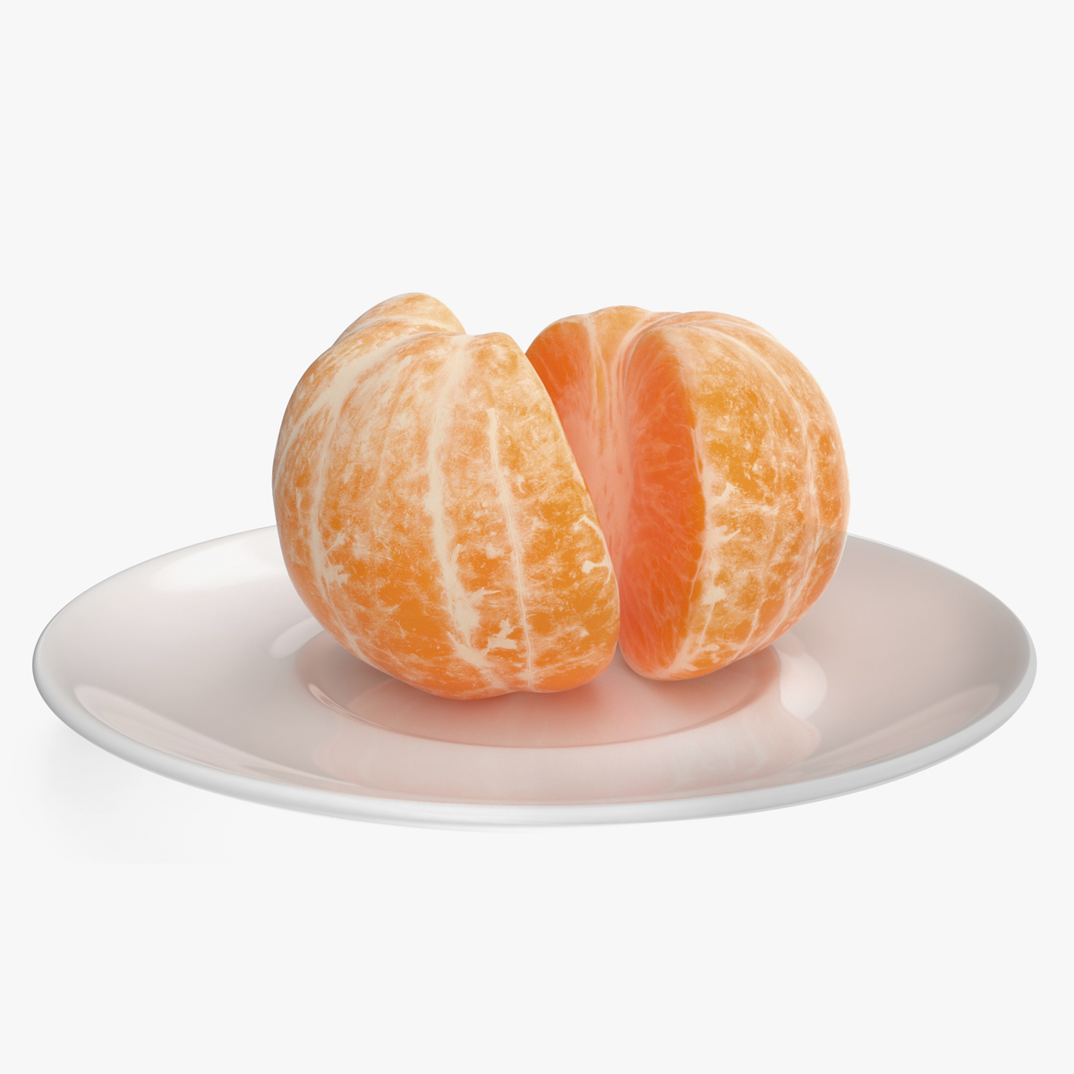 Peeled Tangerine Fruit Split in Half on White Plate is a 3D model of white plate with edible citrus fruit which is widespread dessert food product, and which is peeled tangerine, which is divided into slices (pieces).