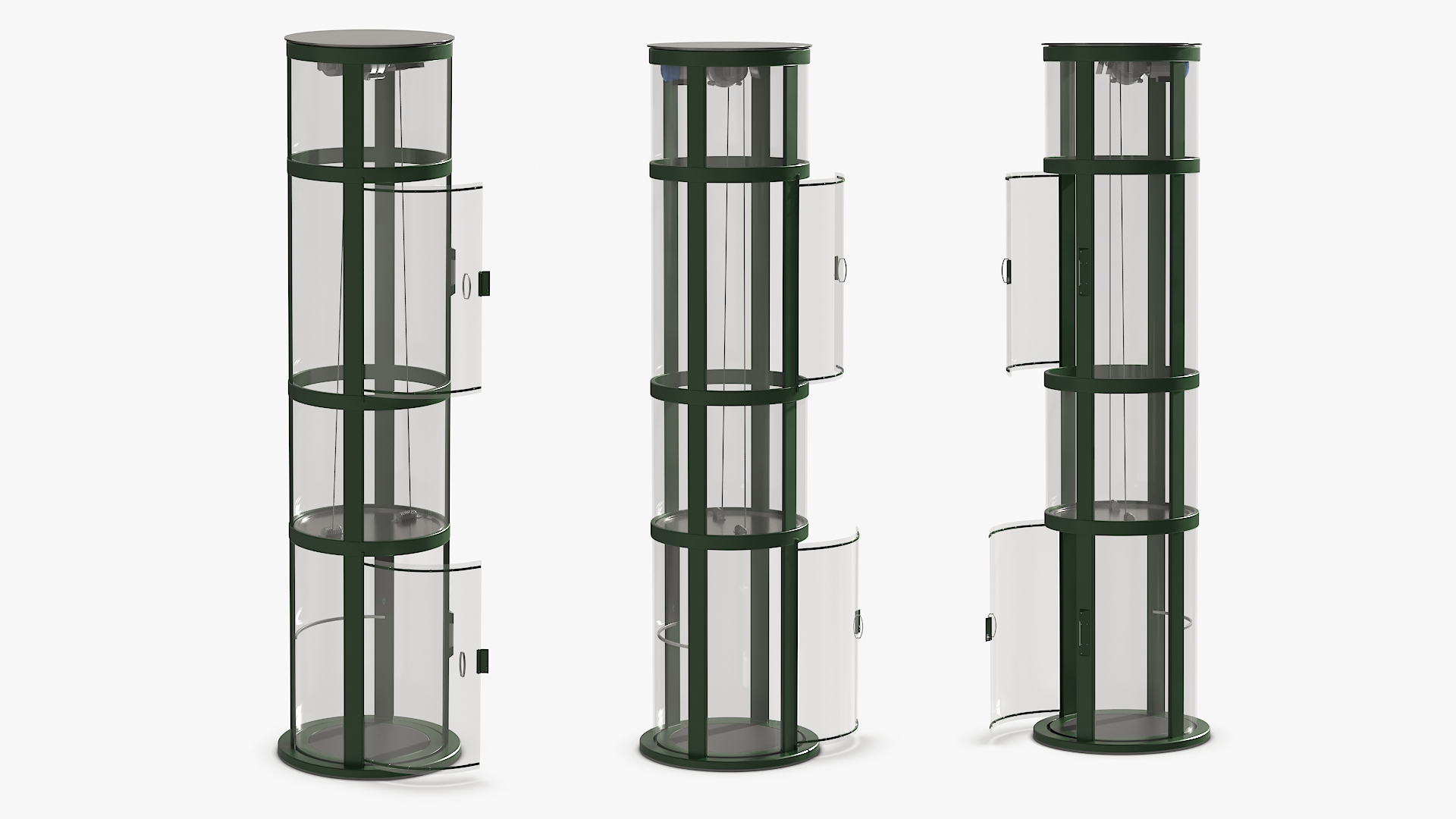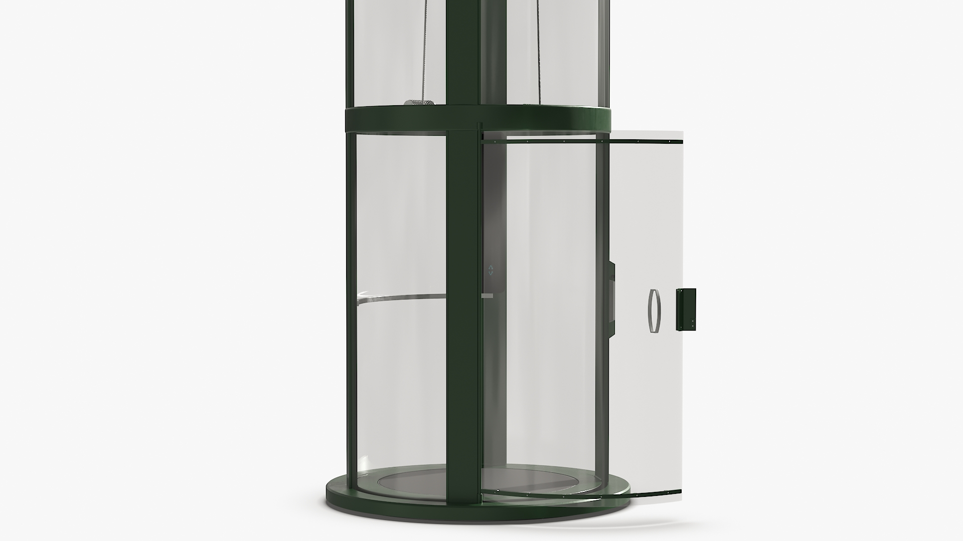 Petite Glass Lift Green is a three-dimensional model of cylindrical glass elevator that is a modern panoramic view type elevator (building passenger lifting machine).
