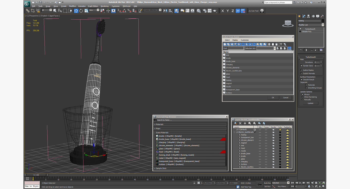 Philips Diamondclean Black Edition Electric Toothbrush with Glass Charger is a high quality, photo real 3d model that will enhance detail and realism to any of your rendering projects. The model has a fully textured, detailed design that allows for close-up renders, and was originally modeled in 3ds Max 2020 and rendered with V-Ray. Renders have no postprocessing!