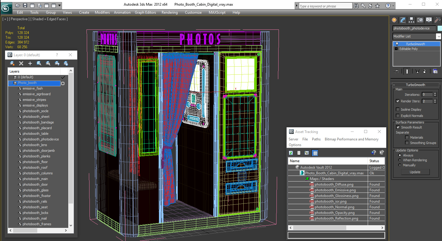 Photo Booth Cabin Digital is a high quality, photo real 3d model that will enhance detail and realism to any of your rendering projects. The model has a fully textured, detailed design that allows for close-up renders, and was originally modeled in 3ds Max 2020 and rendered with V-Ray. Renders have no postprocessing!