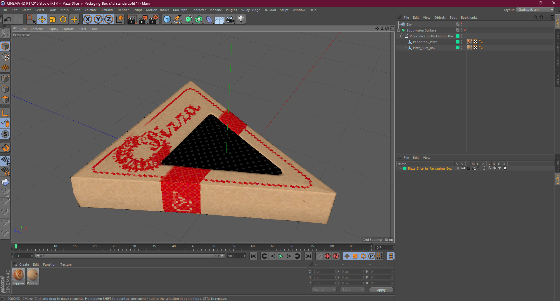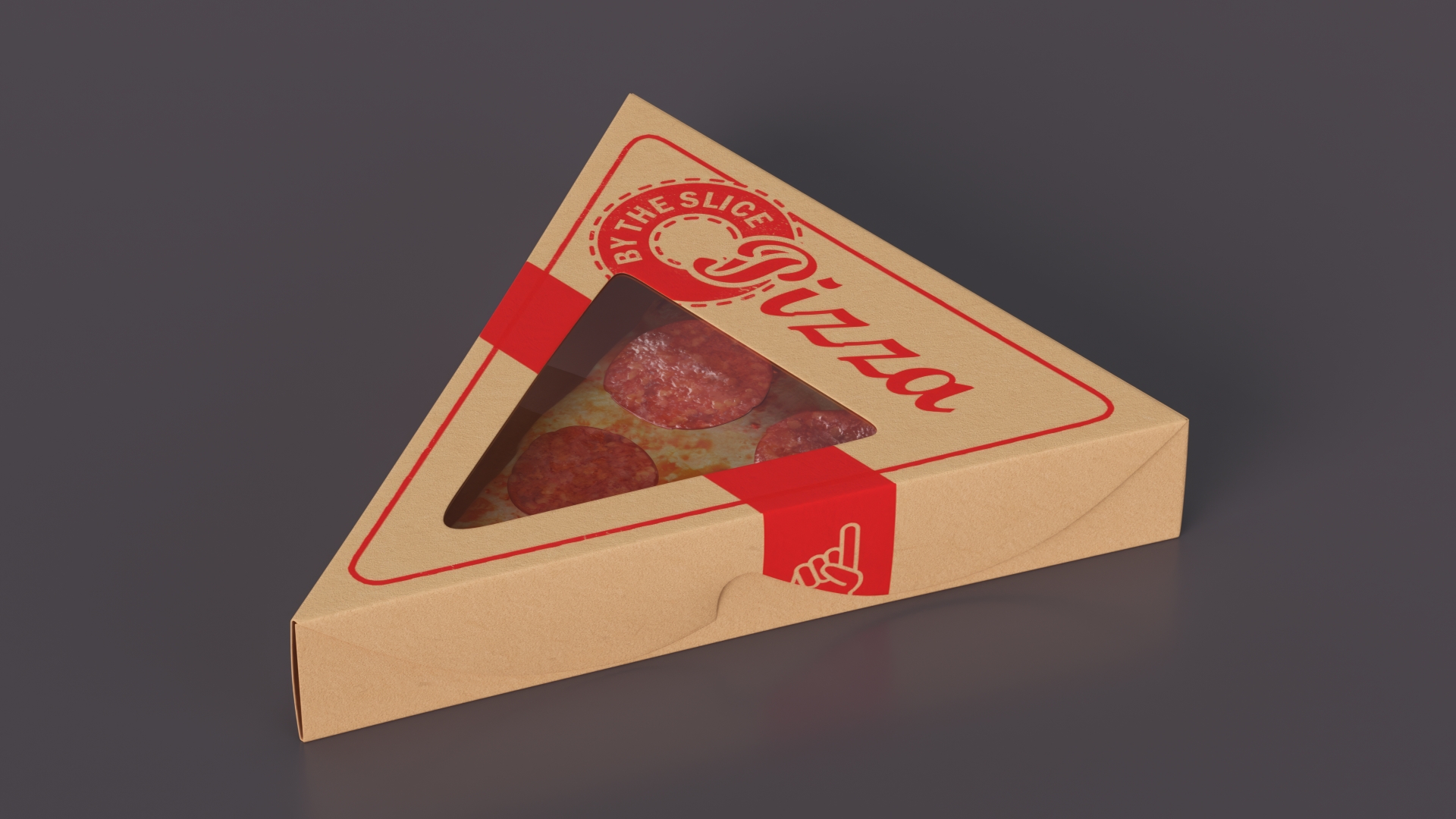 Pizza Slice in Packaging Box is a three-dimensional model of classic Italian-American dish consisting of a crust topped with tomato sauce, mozzarella cheese, and slices of spicy cured pepperoni.