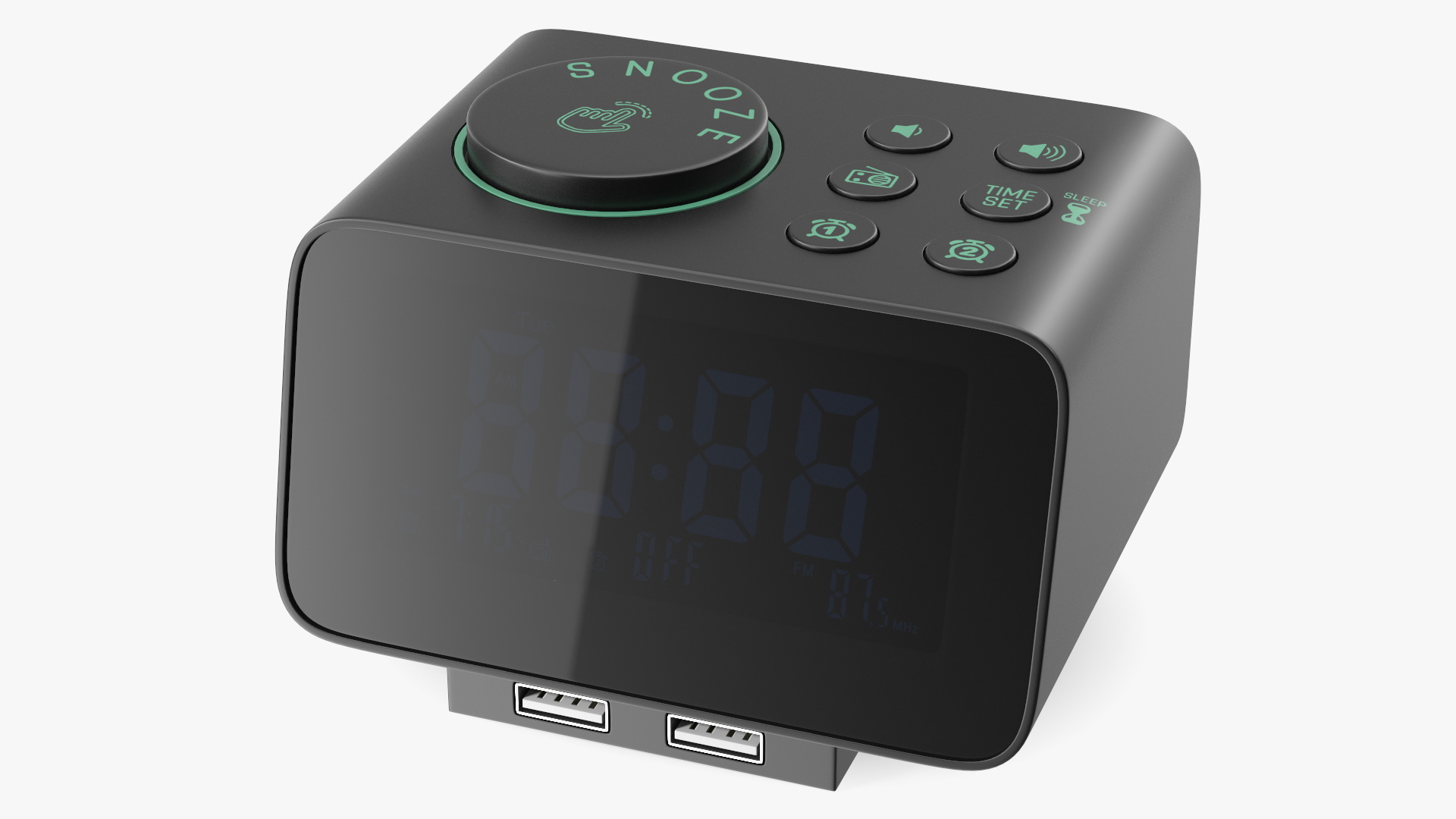 Plastic Alarm Clock Radio Display Off is a three-dimensional model of home digital electronic clock (timepiece appliance) which used for listening audio broadcasts and timestamp timer signaling.