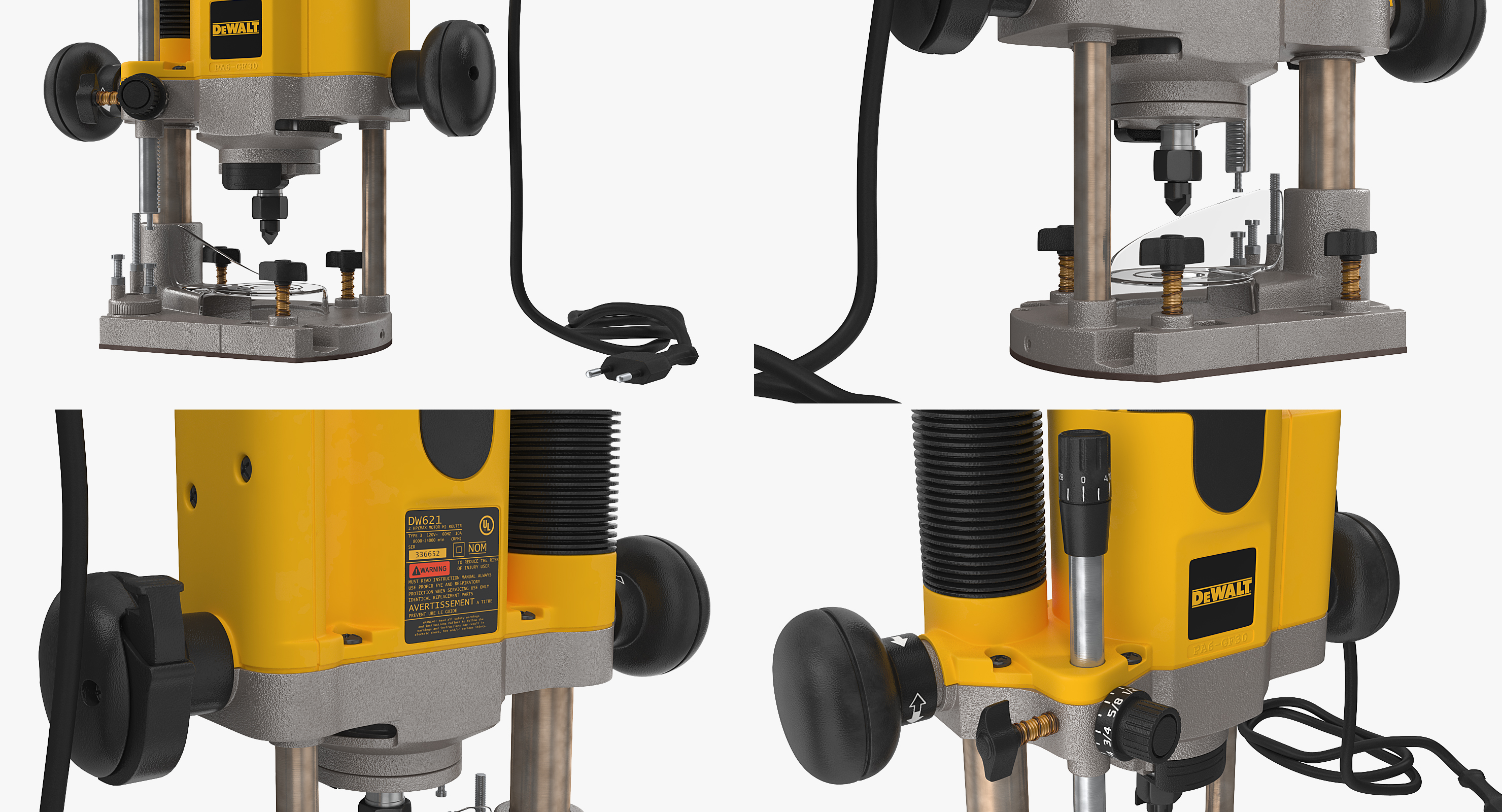 Plunge Router DEWALT DW621 is a high quality, photo real 3d model that will enhance detail and realism to any of your rendering projects. The model has a fully textured, detailed design that allows for close-up renders, and was originally modeled in 3ds Max 2020 and rendered with V-Ray. Renders have no postprocessing!