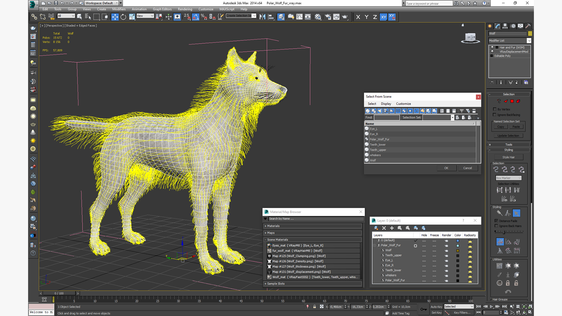 Polar Wolf Fur has a 3dsmax Fur modifier, hair customizable (hair count, hair segments, hair color, root size, tip size, etc).
