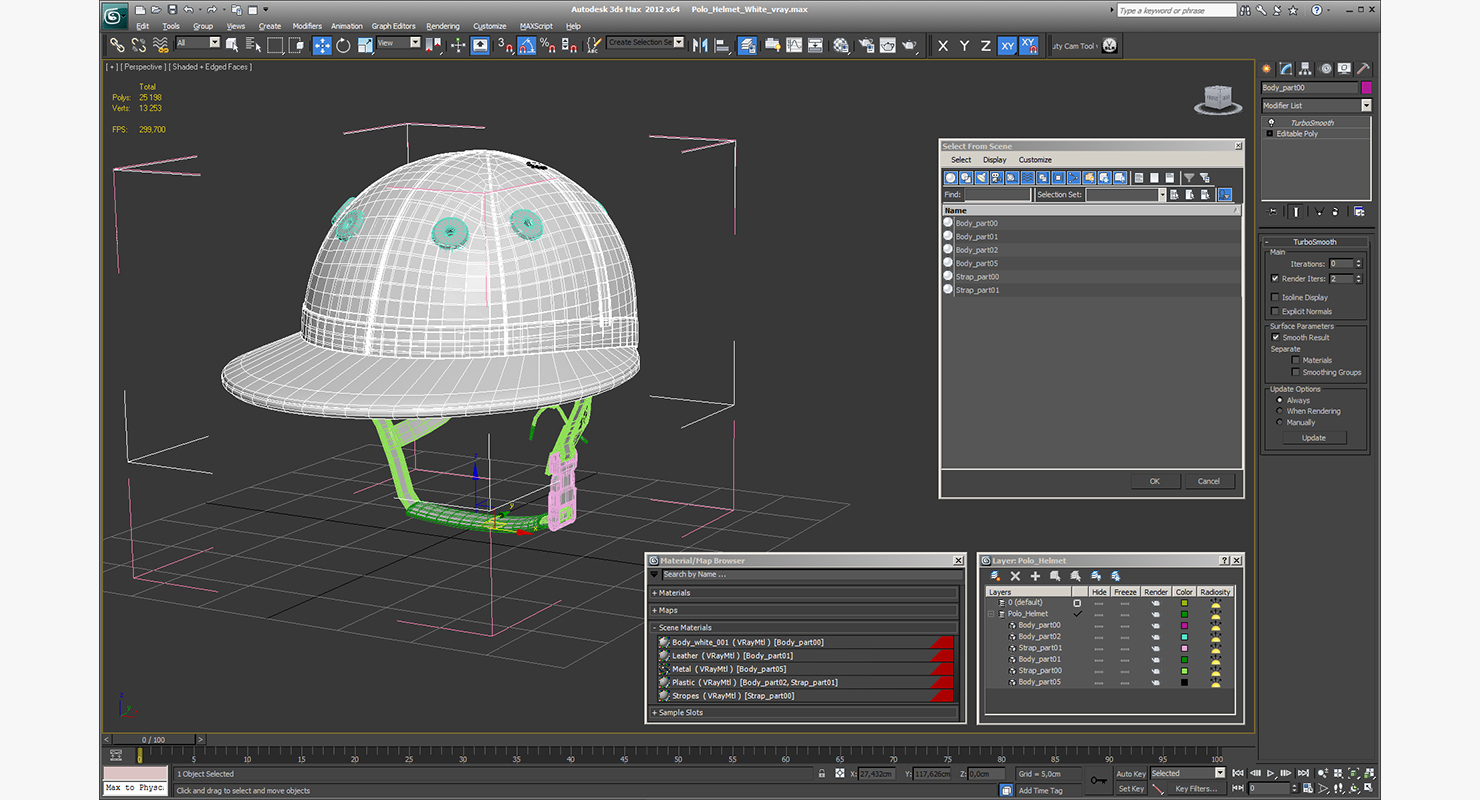 Polo Helmet White is a high quality, photo real 3d model that will enhance detail and realism to any of your rendering projects. The model has a fully textured, detailed design that allows for close-up renders, and was originally modeled in 3ds Max 2020 and rendered with V-Ray. Renders have no postprocessing!