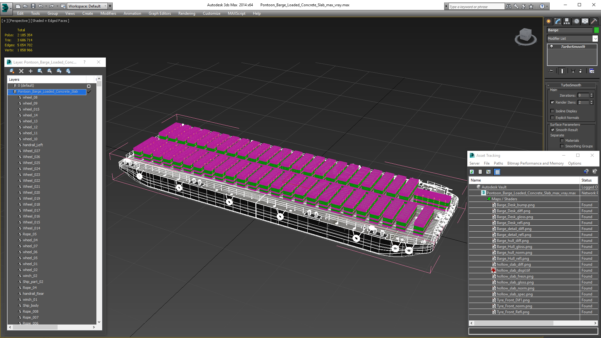 Pontoon Barge Loaded Concrete Slab is a high quality, photo real 3d model that will enhance detail and realism to any of your rendering projects. The model has a fully textured, detailed design that allows for close-up renders, and was originally modeled in 3ds Max 2020 and rendered with V-Ray. Renders have no postprocessing!
