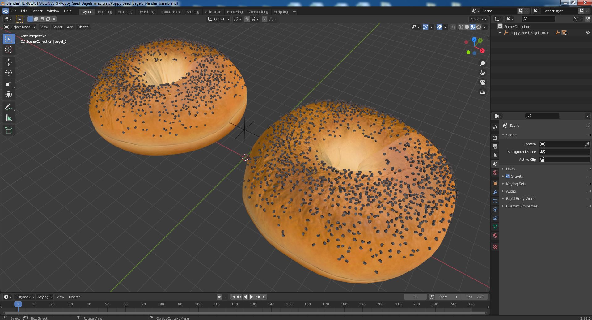 Poppy Seed Bagels is a high quality, photo real 3d model that will enhance detail and realism to any of your rendering projects. The model has a fully textured, detailed design that allows for close-up renders, and was originally modeled in 3ds Max 2020 and rendered with V-Ray. Renders have no postprocessing!