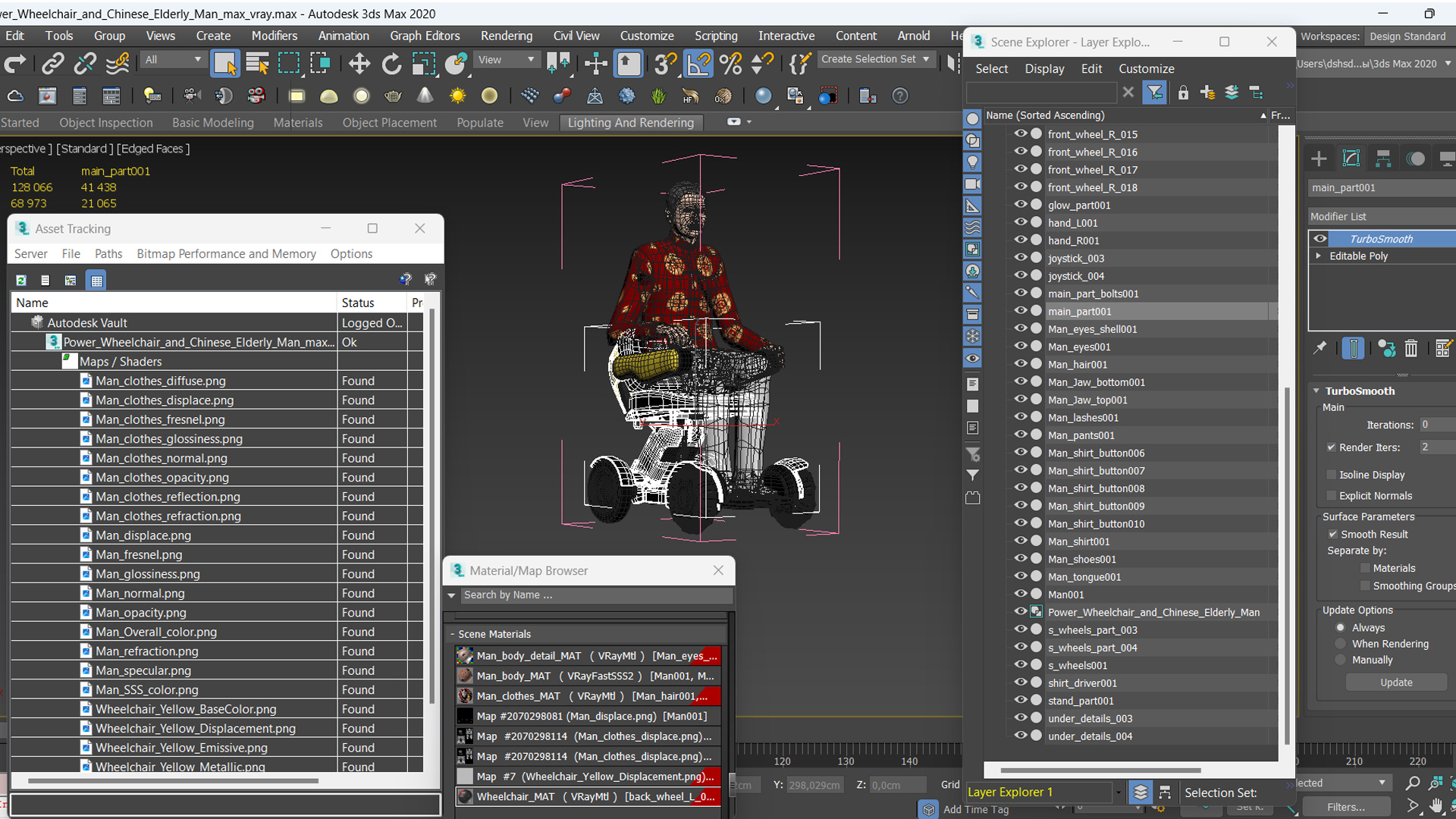 Power Wheelchair and Chinese Elderly Man is a high quality, photo real 3d model that will enhance detail and realism to any of your rendering projects. The model has a fully textured, detailed design that allows for close-up renders, and was originally modeled in 3ds Max 2020 and rendered with V-Ray. Renders have no postprocessing!