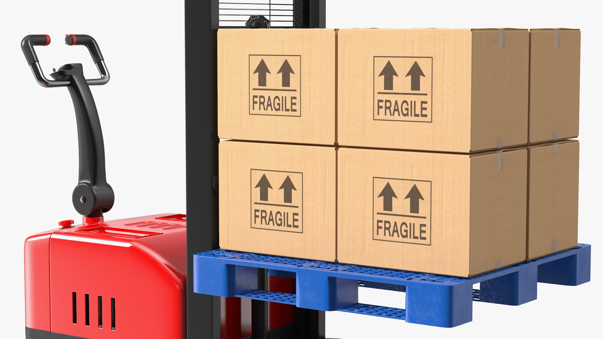 Powered Stacker Everest Red with Stack of Boxes is a three-dimensional model of cardboard boxes (carton containers) and plastic pallet, which are placed on electric pallet stacker (electric powered forklift, warehouse stacker or electrical pallet lift).