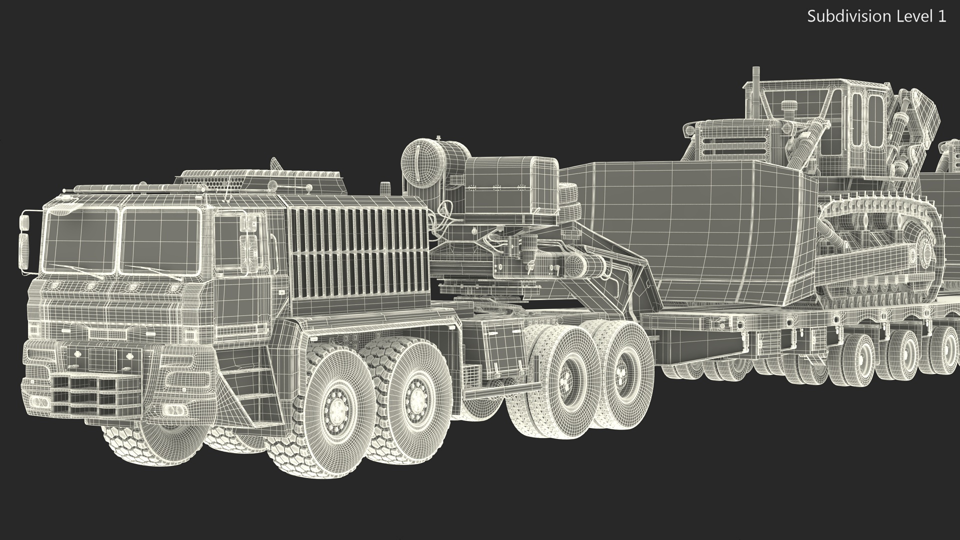 Powerful Duty Truck with Lowboy Trailer and Bulldozers is a three-dimensional model of heavy haulage tractor that is a heavy-duty hauler that is designed for transporting heavy goods.
