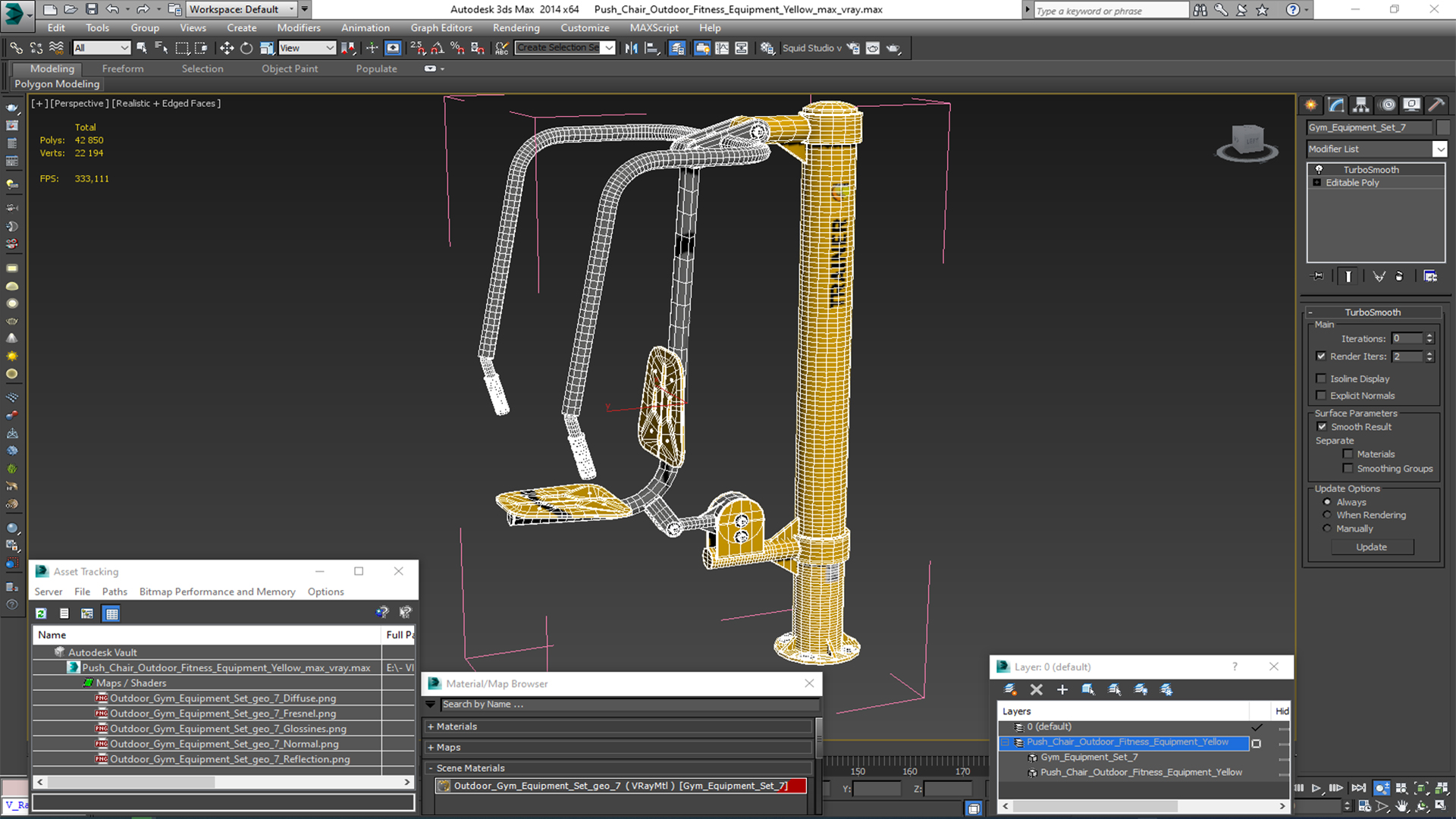 Push Chair Outdoor Fitness Equipment Yellow is a high quality, photo real 3d model that will enhance detail and realism to any of your rendering projects. The model has a fully textured, detailed design that allows for close-up renders, and was originally modeled in 3ds Max 2020 and rendered with V-Ray. Renders have no postprocessing!