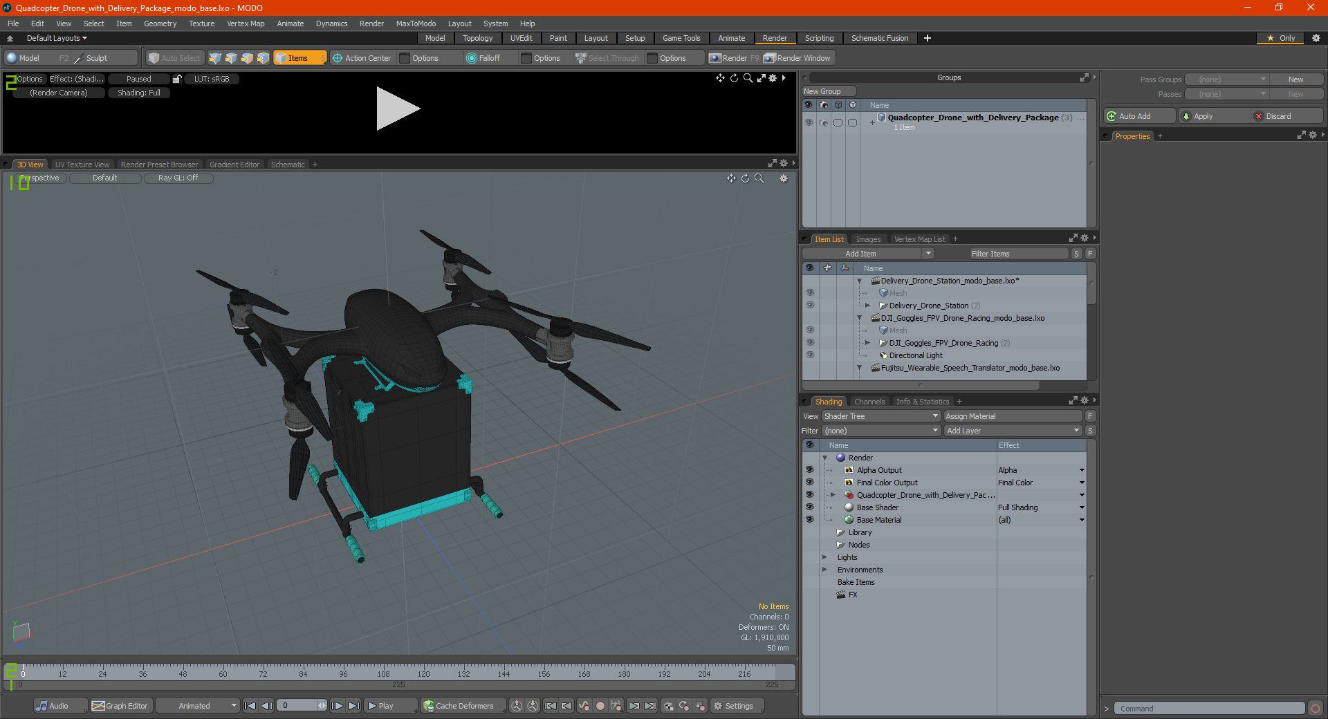 Quadcopter Drone with Delivery Package is a high quality, photo real 3d model that will enhance detail and realism to any of your rendering projects. The model has a fully textured, detailed design that allows for close-up renders, and was originally modeled in 3ds Max 2020 and rendered with V-Ray. Renders have no postprocessing!