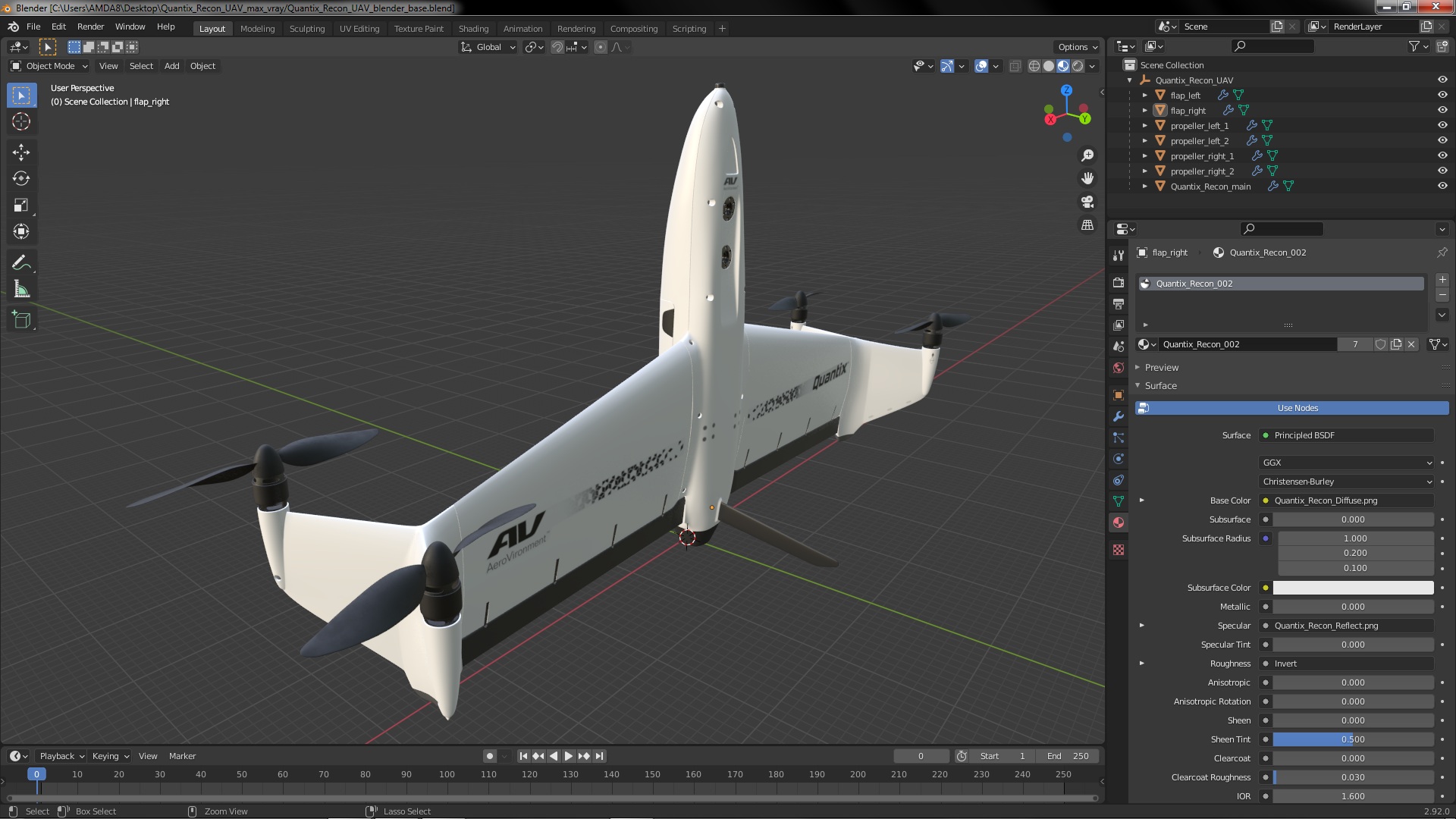 Quantix Recon UAV is a high quality, photo real 3d model that will enhance detail and realism to any of your rendering projects. The model has a fully textured, detailed design that allows for close-up renders, and was originally modeled in 3ds Max 2020 and rendered with V-Ray. Renders have no postprocessing!