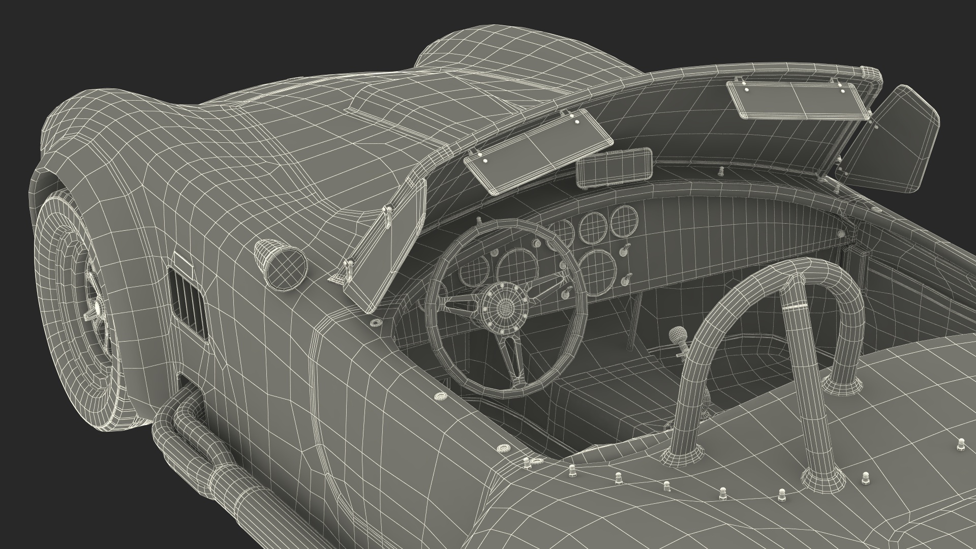 This model features an accurate representation of the iconic sports car, including its sleek, aerodynamic body, classic racing stripes, and distinctive Cobra emblems. The rigging allows for comprehensive animation with functional steering, suspension, and wheel movement, providing a high level of realism for motion simulations. Attention to detail in the textures and components ensures an authentic look and feel.