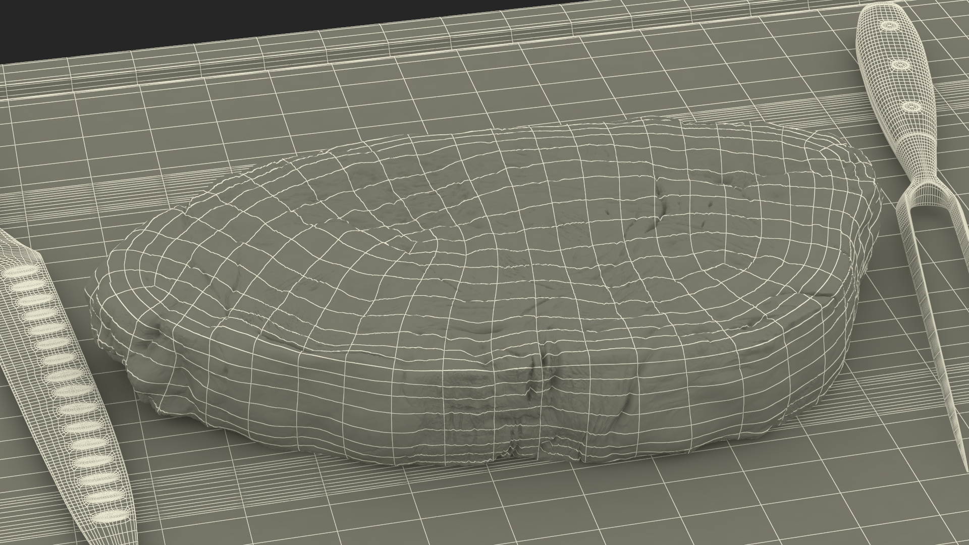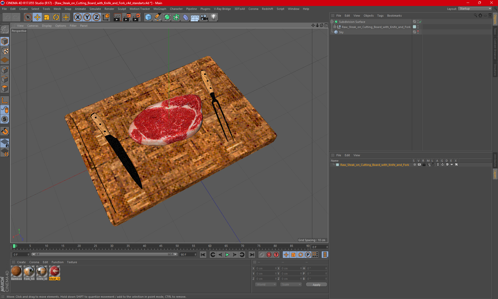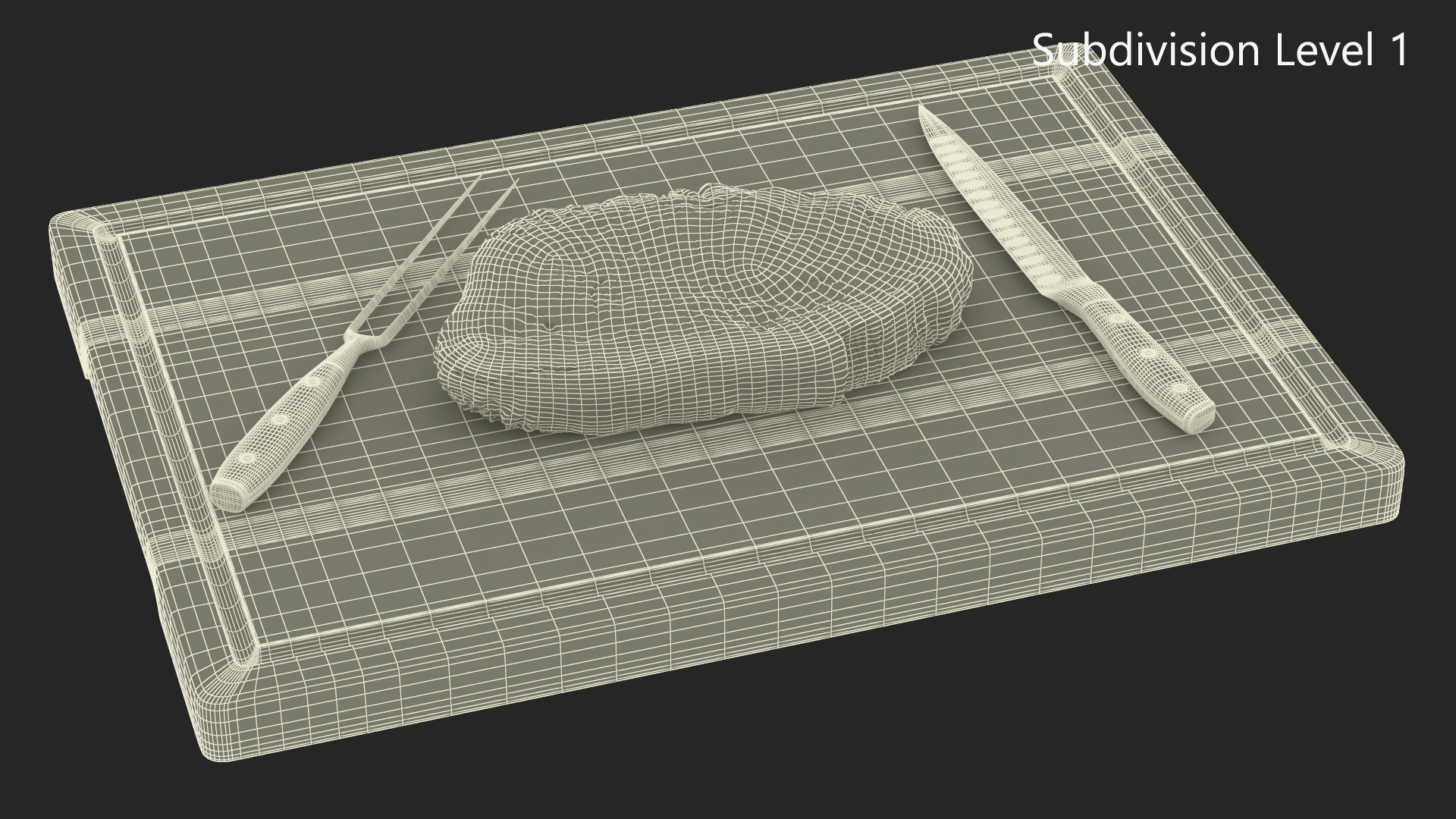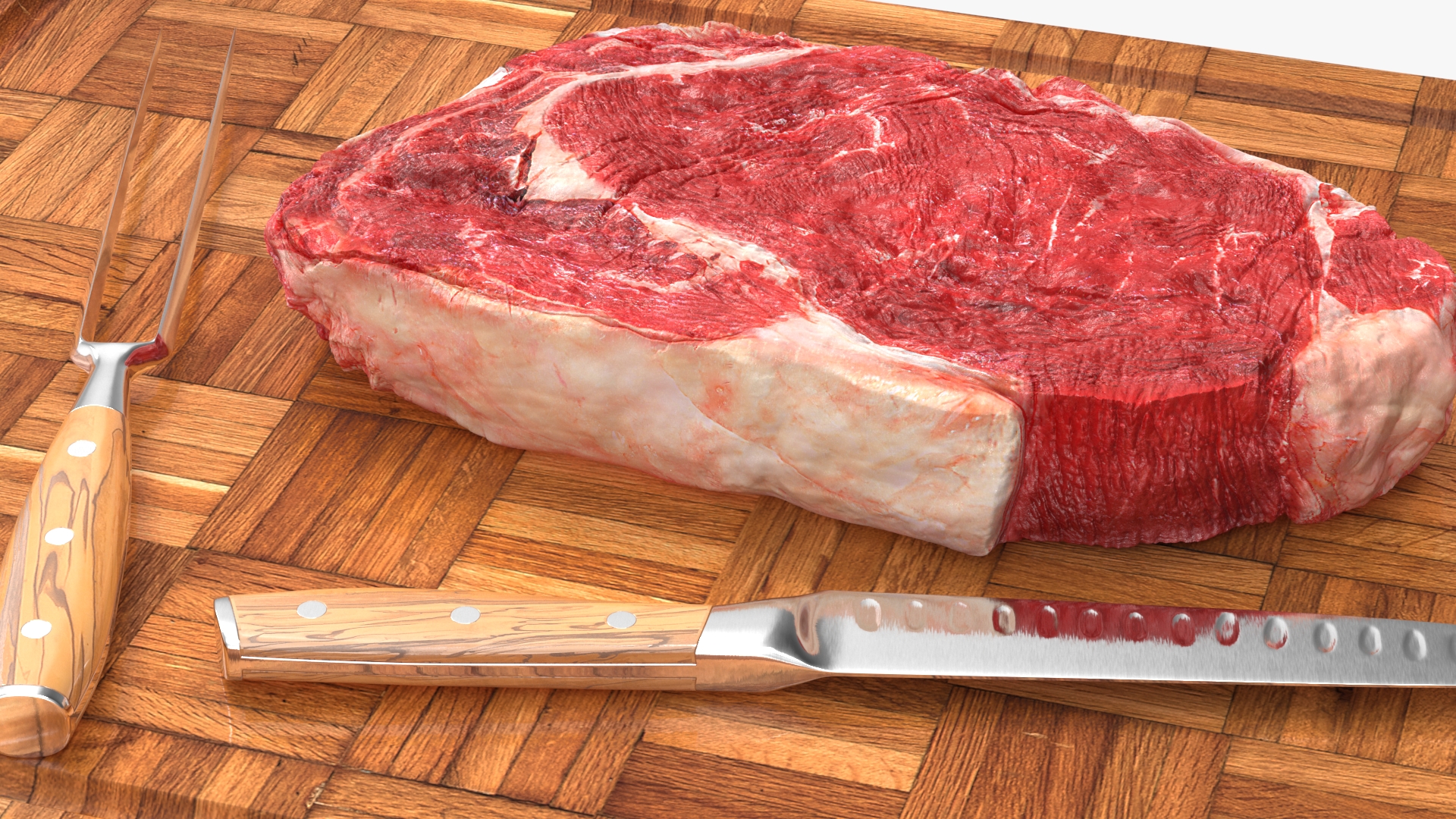 Raw Steak on Cutting Board with Knife and Fork is a three-dimensional model of raw meat piece (slice) with set of kitchen tools (knife and fork) for slicing and cutting of raw meat.