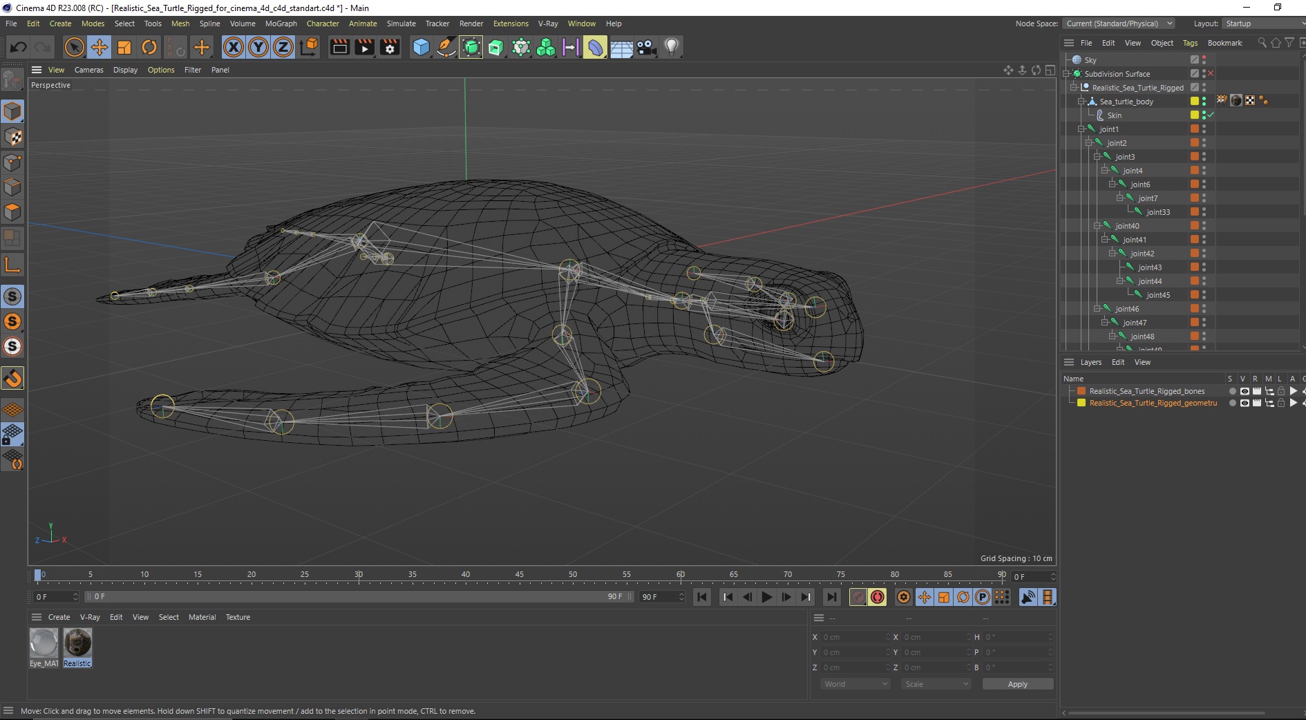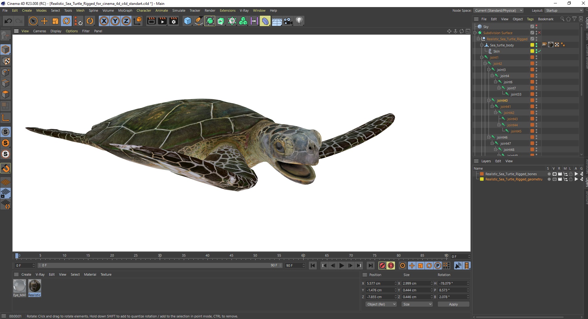 Realistic Sea Turtle Rigged for Cinema 4D is fully rigged and is ready to be animated in Cinema 4D. You can easily position it the way you need or animate it the way your project requires. See the screenshots to get an idea of how rigging works. The pose of the model on the render images is an example and can be recreated using rig, it is not initially included into the product.