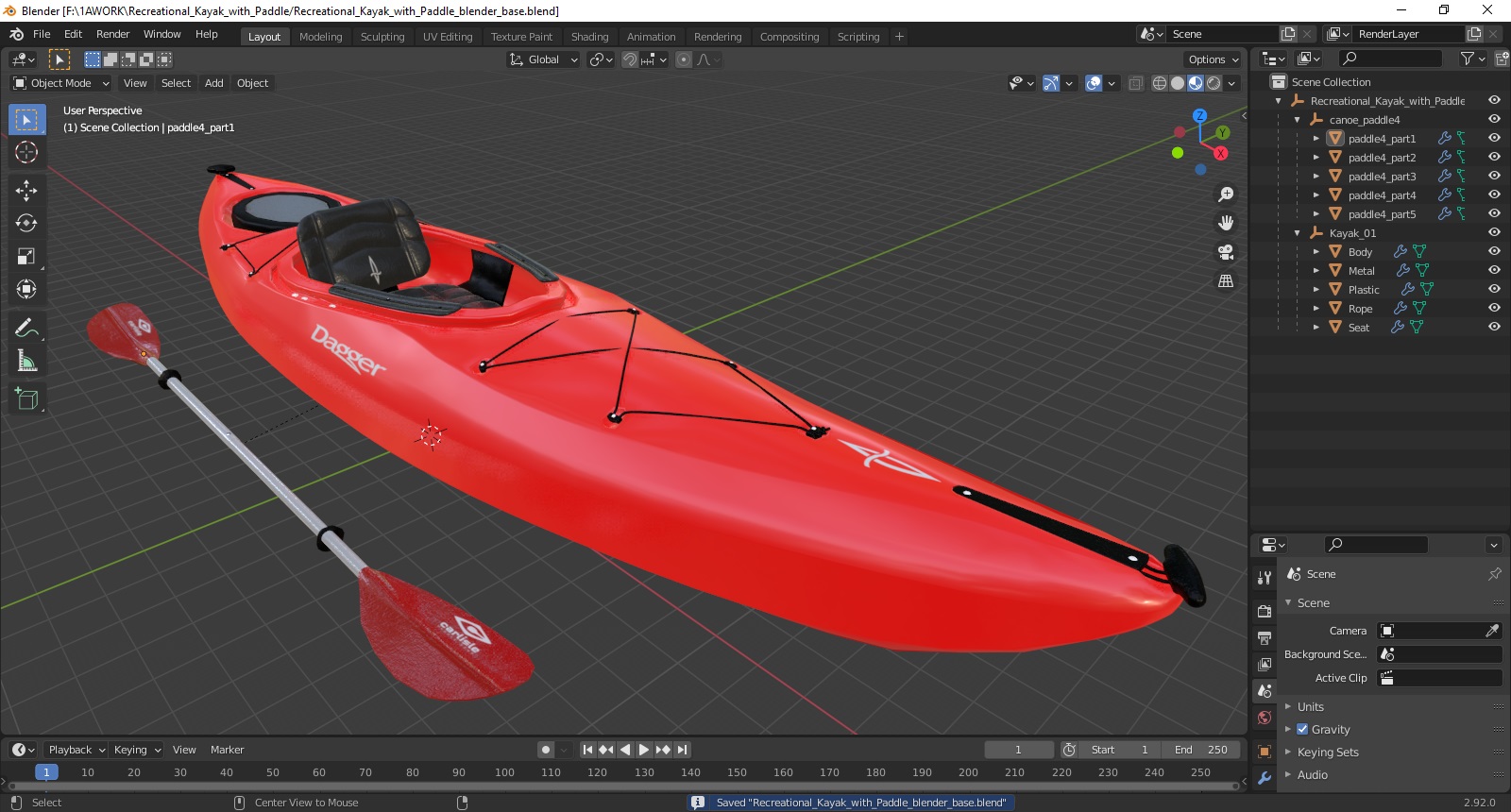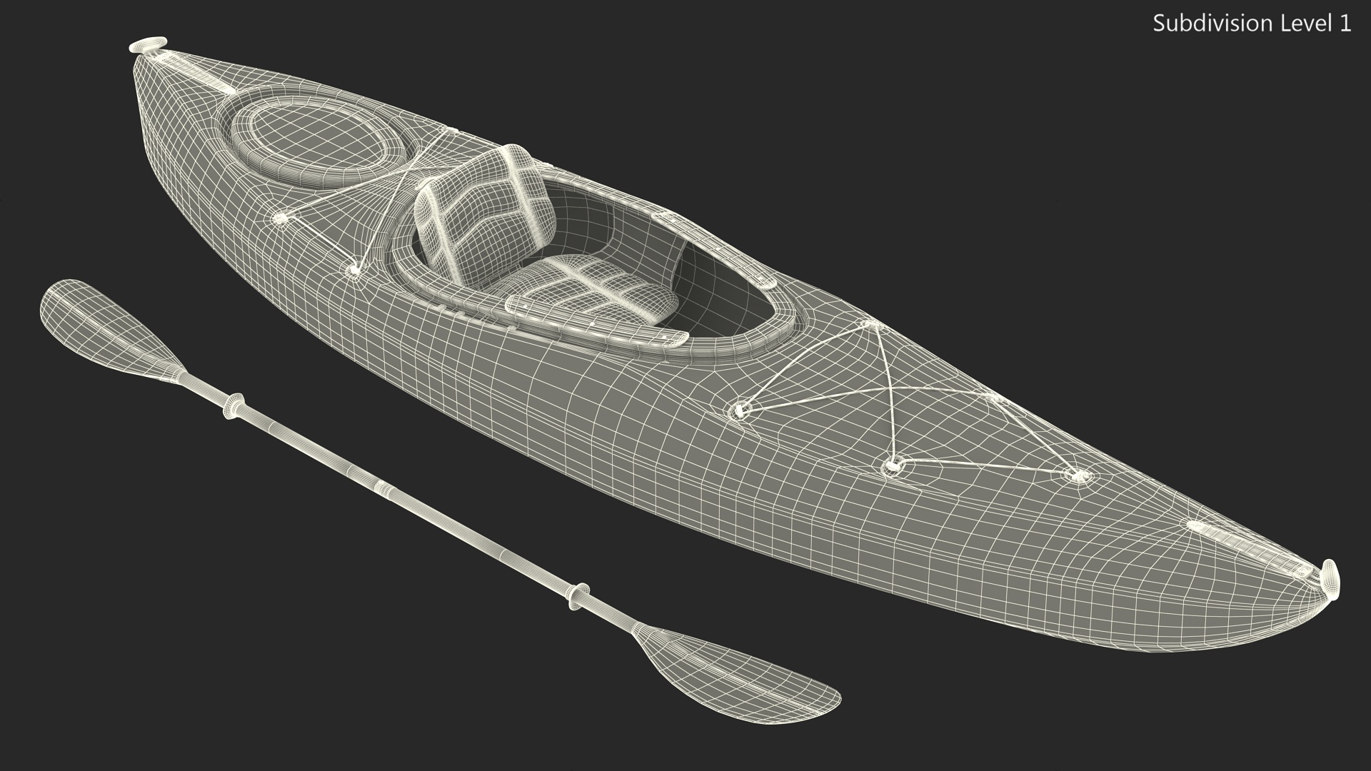 Recreational Kayak with Paddle is a three-dimensional model of small, lightweight watercraft designed for leisurely paddling on calm lakes, rivers, and coastal waters.