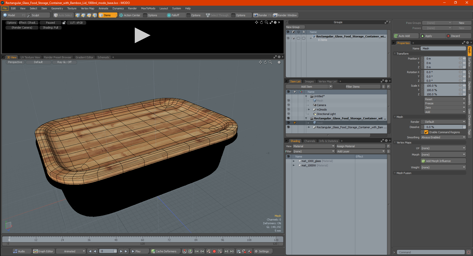 Rectangular Glass Food Storage Container with Bamboo Lid 1000ml is a high quality, photo real 3d model that will enhance detail and realism to any of your rendering projects. The model has a fully textured, detailed design that allows for close-up renders, and was originally modeled in 3ds Max 2020 and rendered with V-Ray. Renders have no postprocessing!