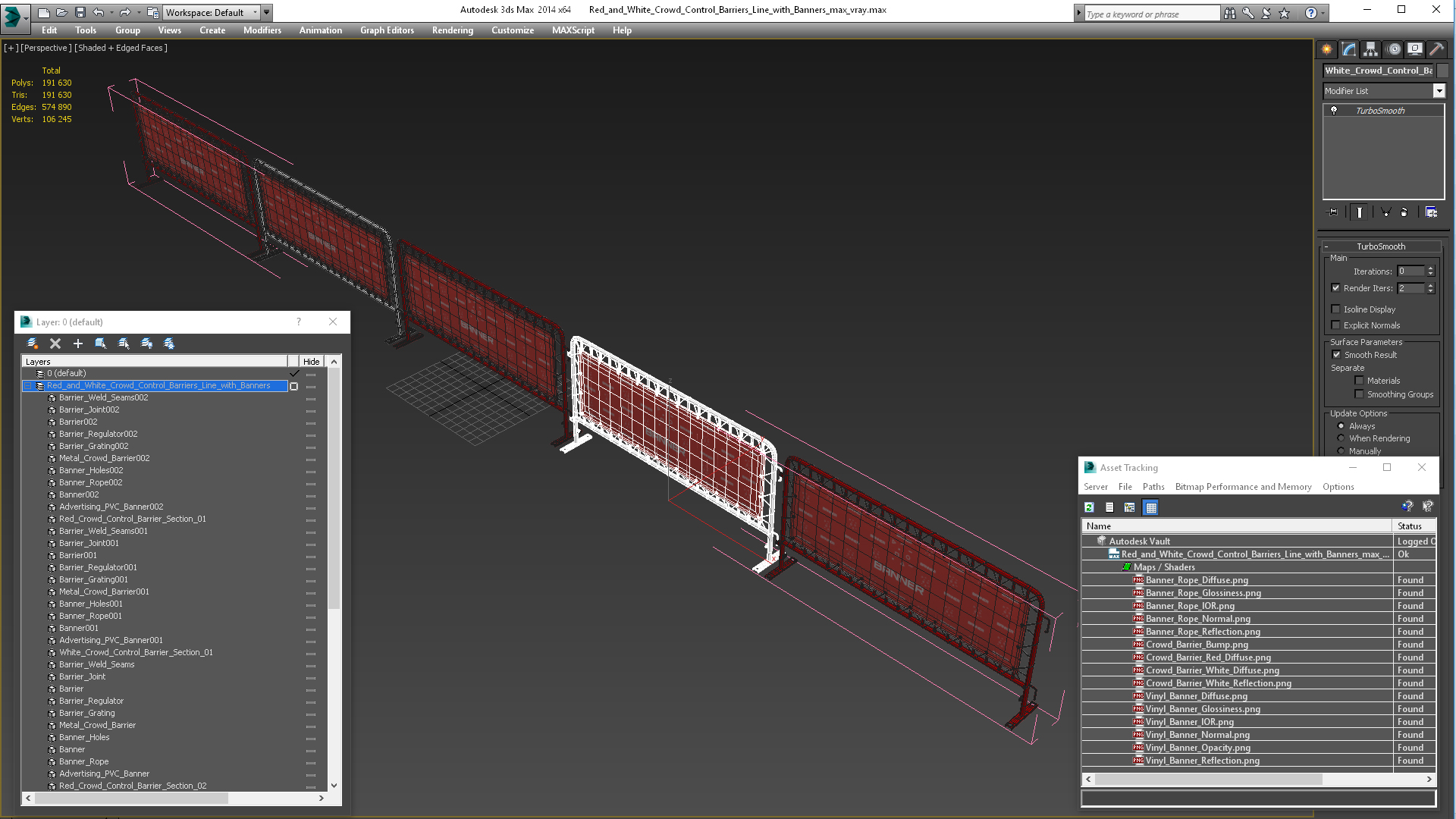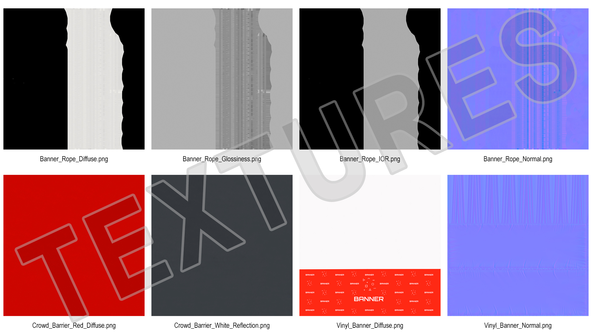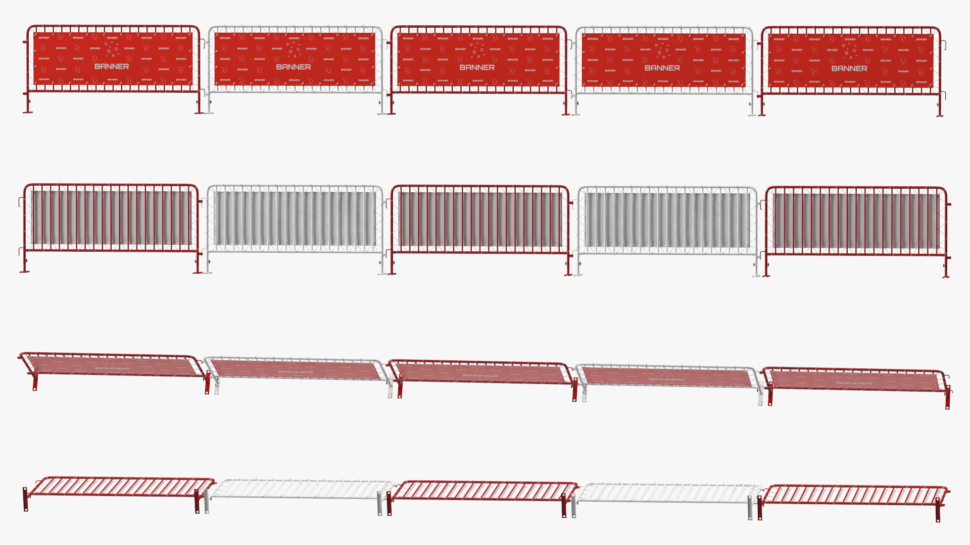 Red and White Crowd Control Barriers Line with Banners is a high quality, photo real 3d model that will enhance detail and realism to any of your rendering projects. The model has a fully textured, detailed design that allows for close-up renders, and was originally modeled in 3ds Max 2020 and rendered with V-Ray. Renders have no postprocessing!