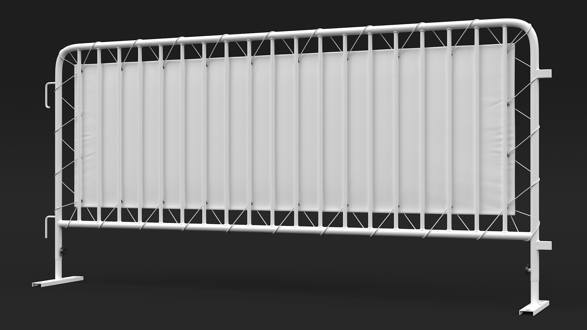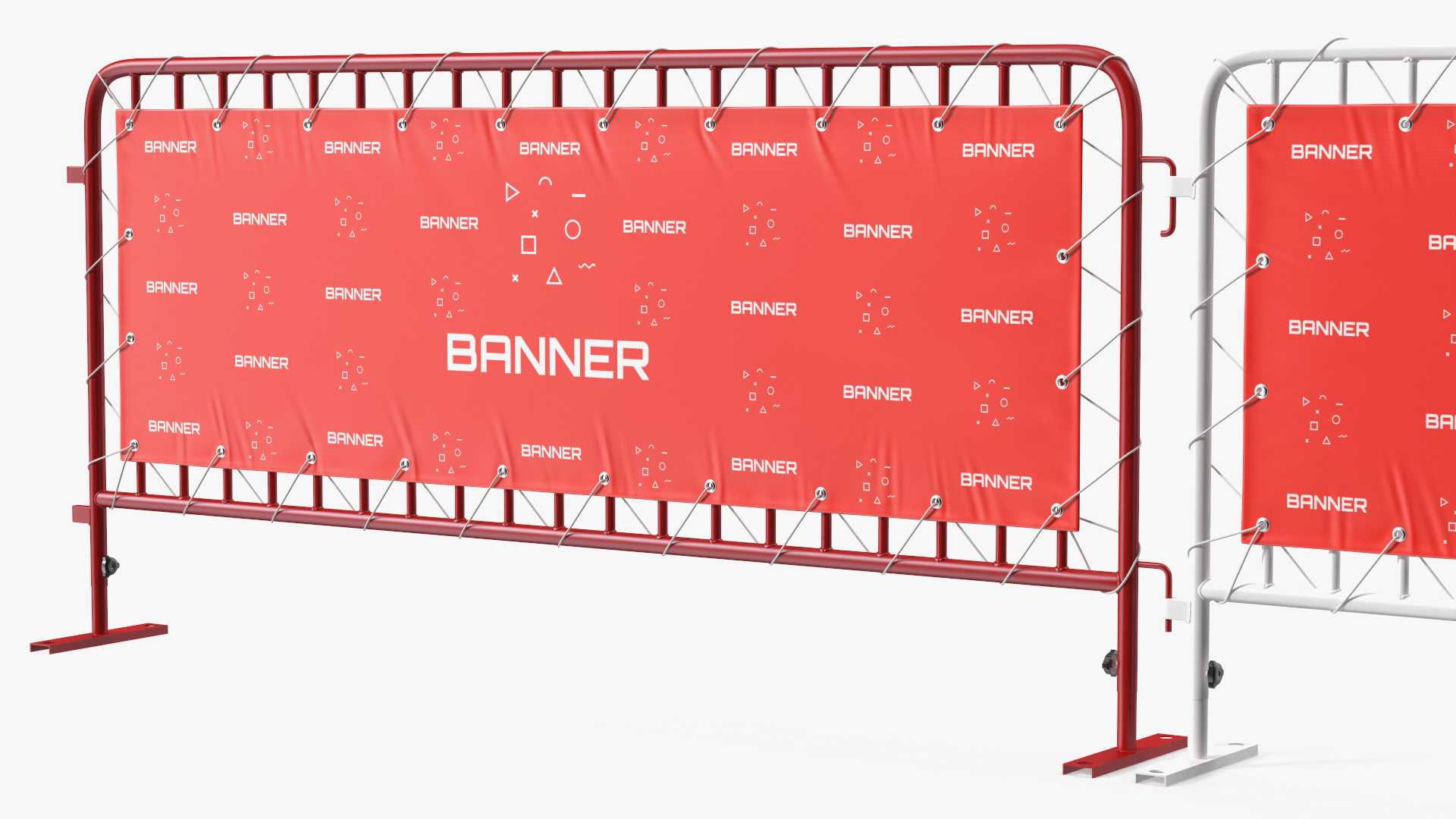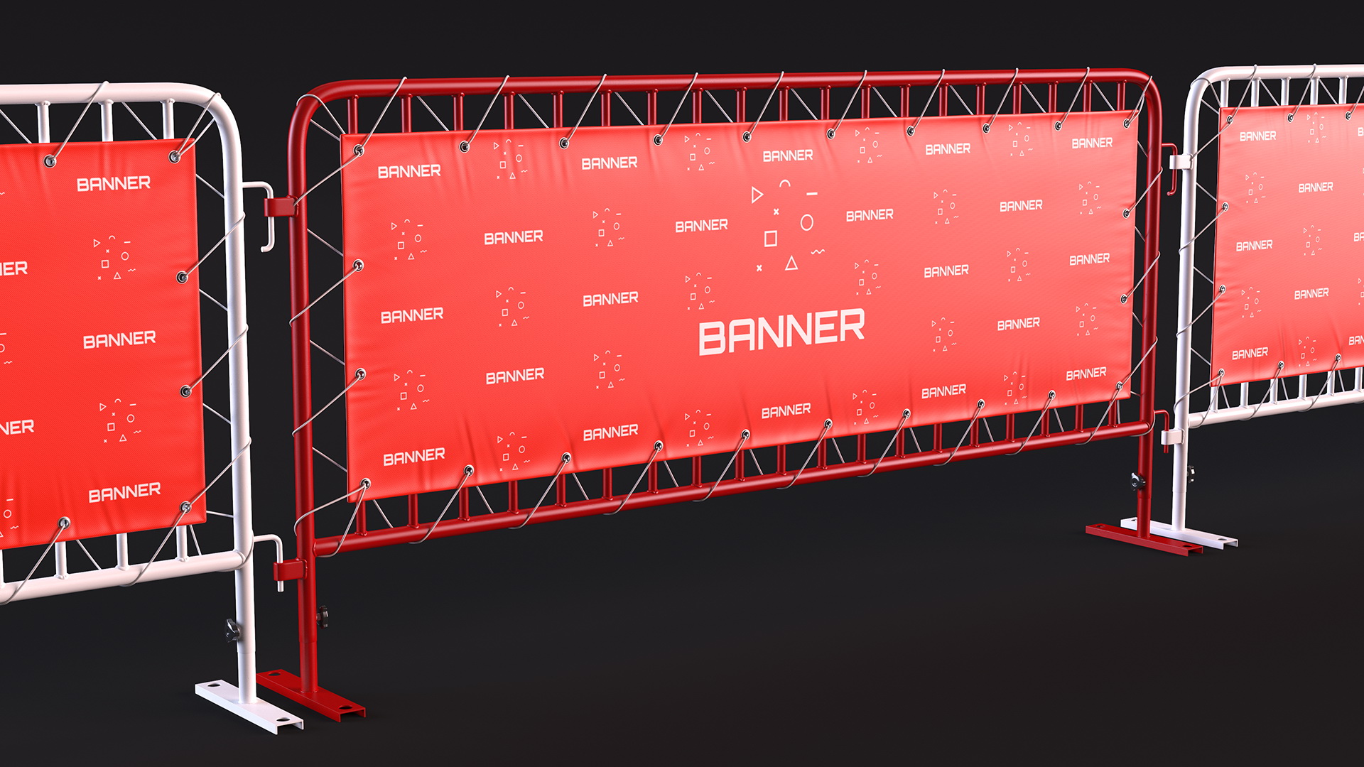 Red and White Crowd Control Barriers Line with Banners is a 3D model of mockup of set of street barriers which are street type restricted zone accessories or specifically designed equipment (forbidden public area special tools) with a special fabric banners with advertising content.
