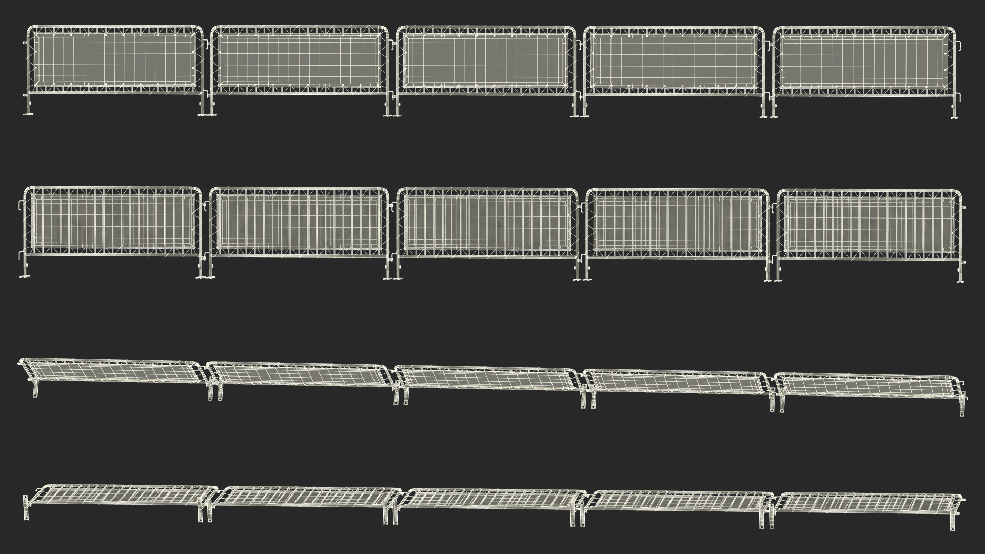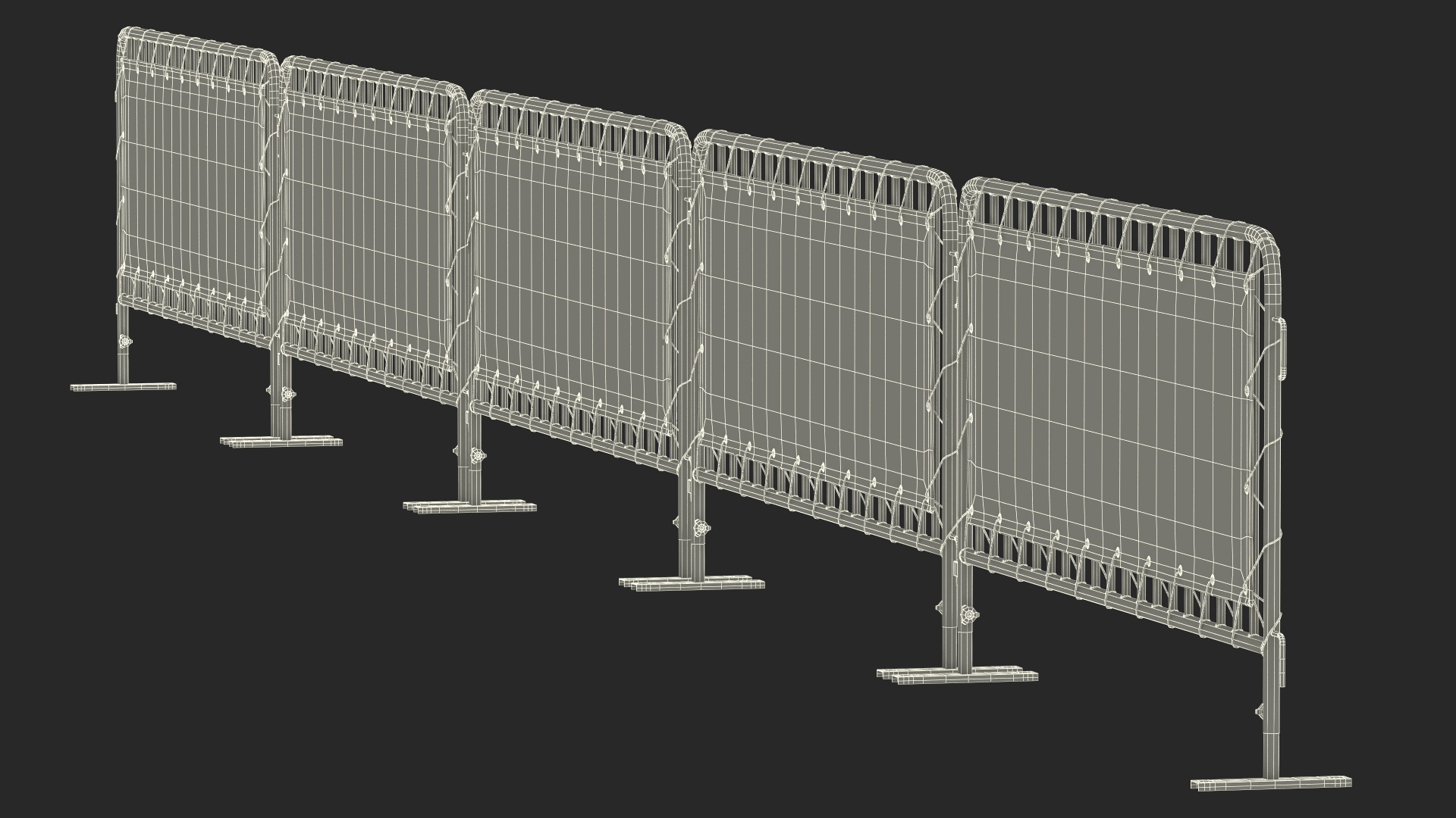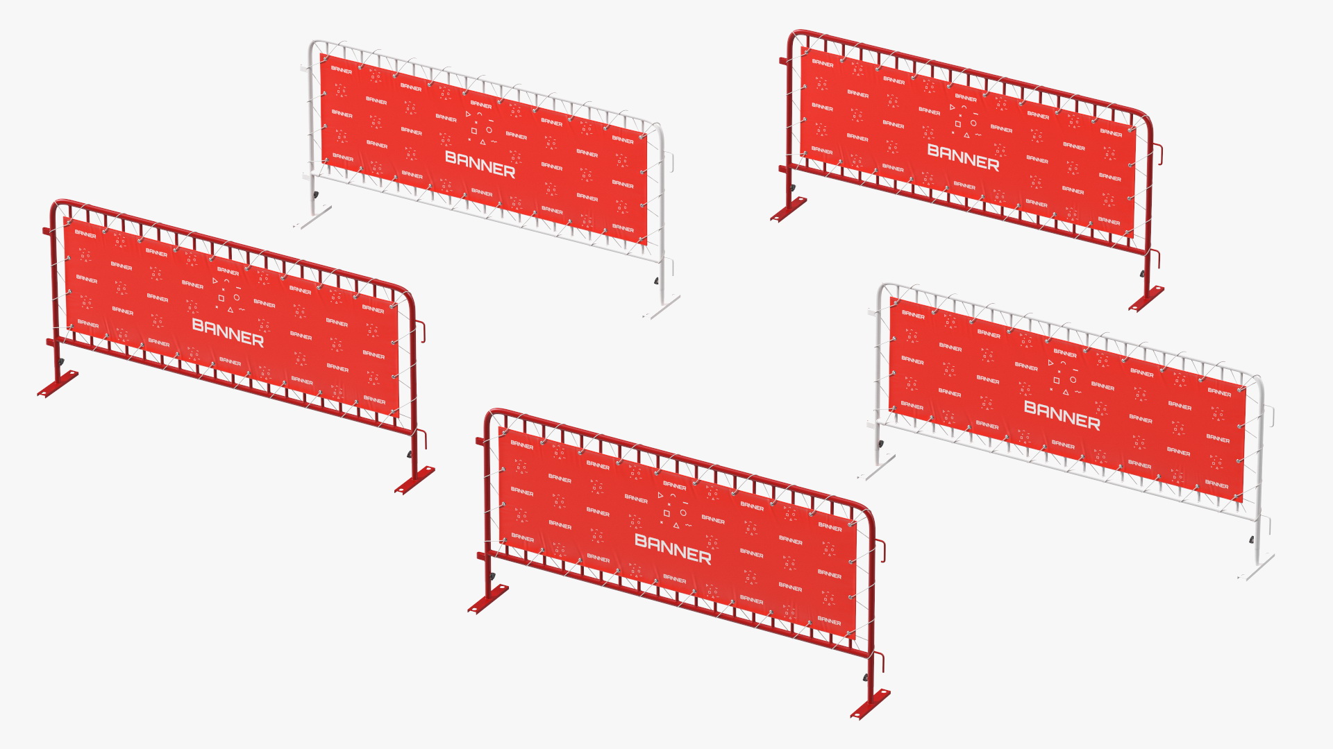 Red and White Crowd Control Barriers Line with Banners is a 3D model of mockup of set of street barriers which are street type restricted zone accessories or specifically designed equipment (forbidden public area special tools) with a special fabric banners with advertising content.