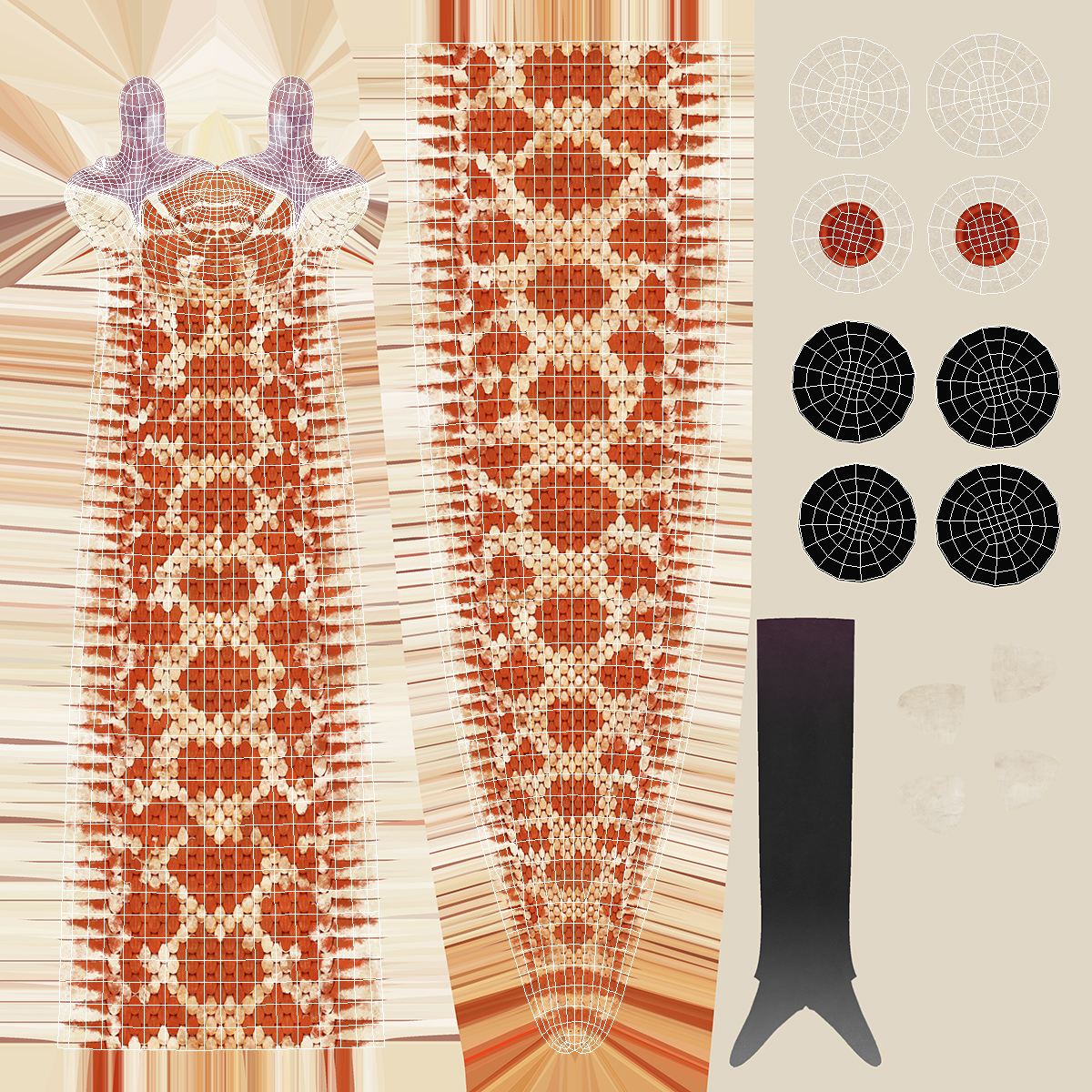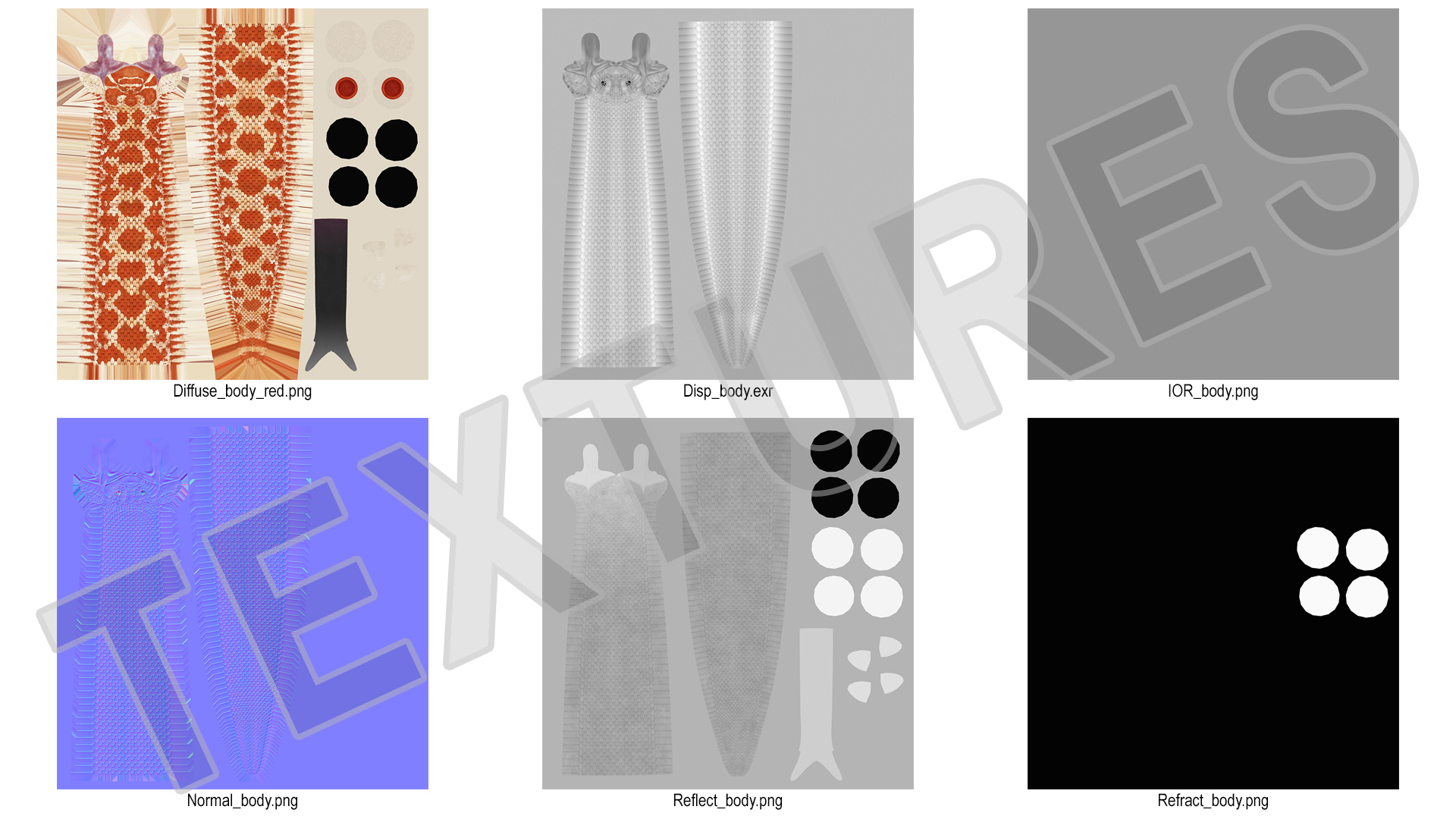 All textures and materials are included and mapped. (All colors can be easily modified.)