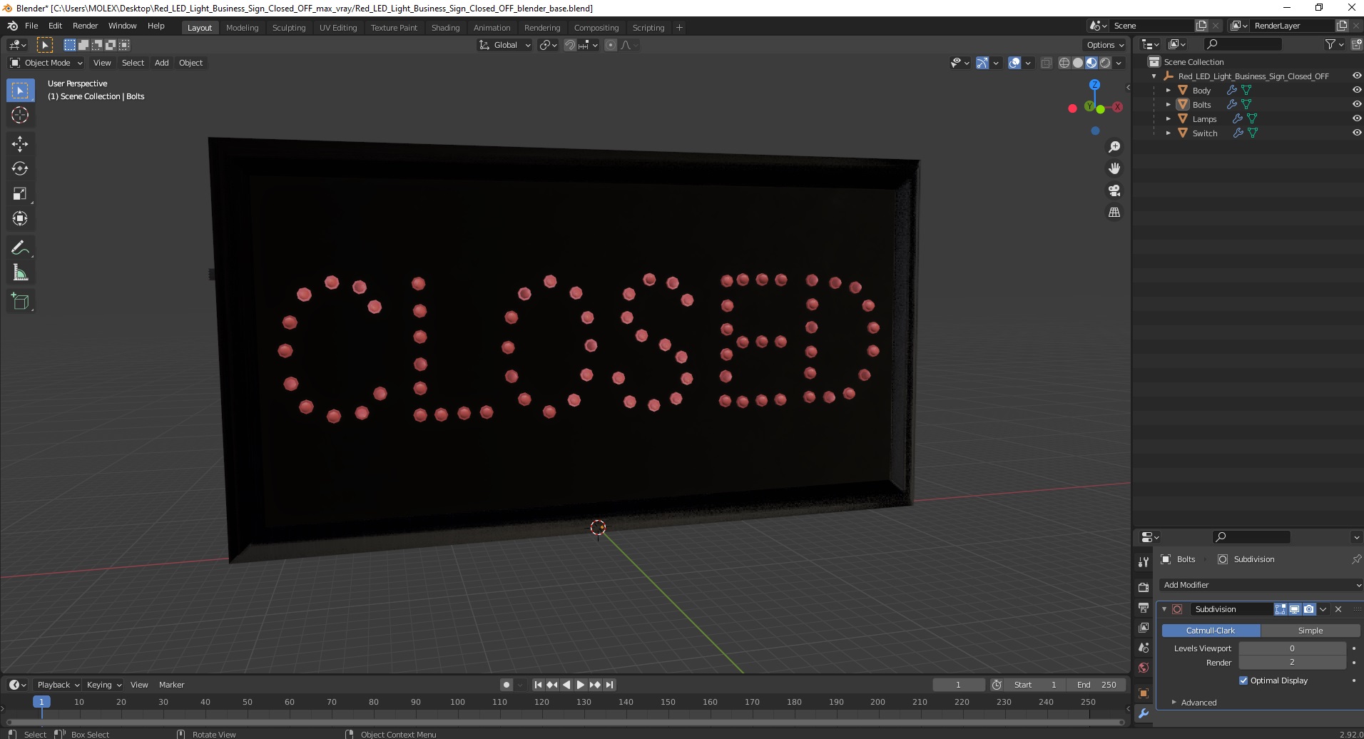 Red LED Light Business Sign Closed OFF is a high quality, photo real 3d model that will enhance detail and realism to any of your rendering projects. The model has a fully textured, detailed design that allows for close-up renders, and was originally modeled in 3ds Max 2020 and rendered with V-Ray. Renders have no postprocessing!