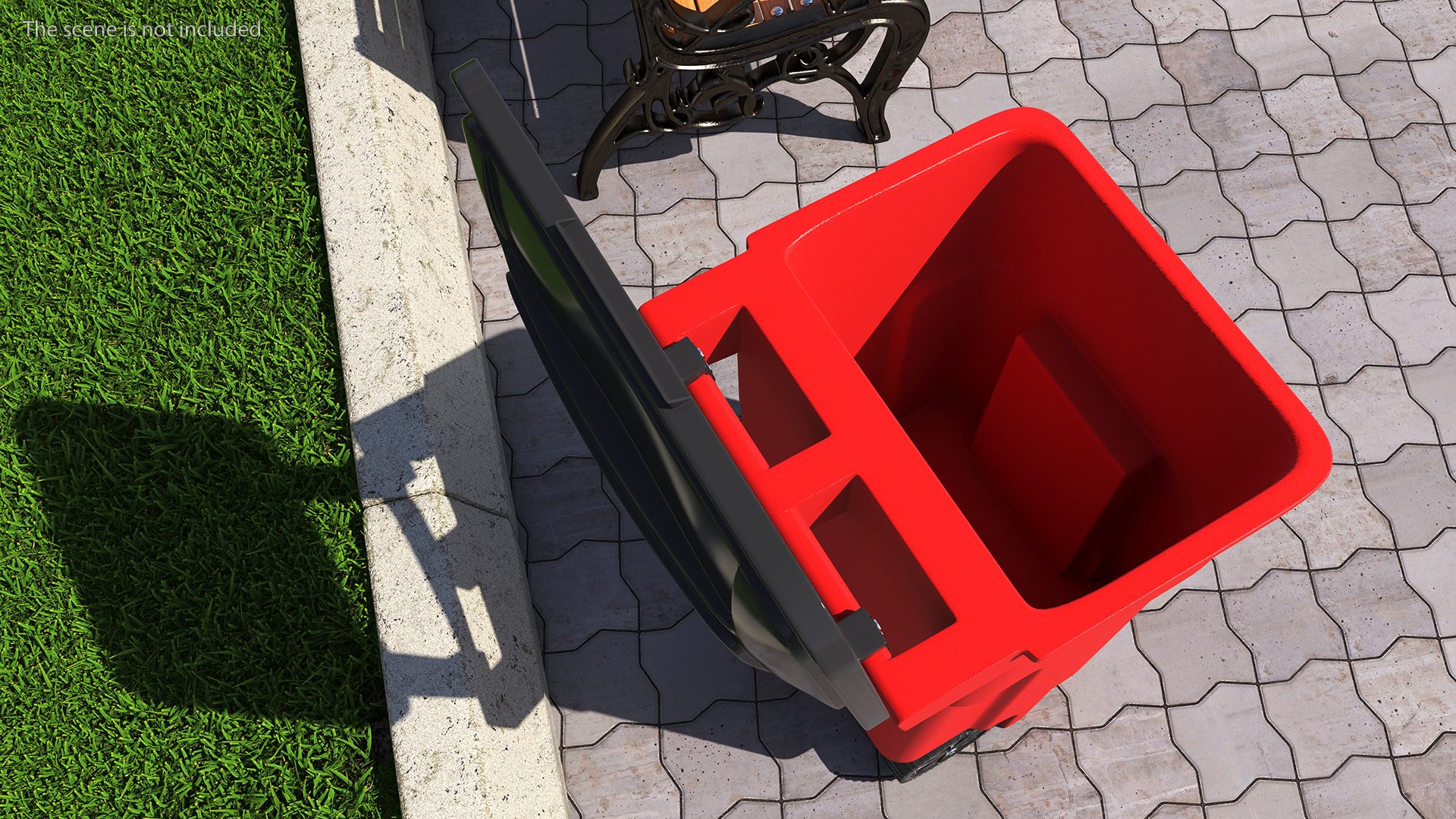 Red Plastic Wheeled Kitchen Trash Can is a three-dimensional model of plastic recycling waste bin with a lid and wheels which is a portable container designed for the collection and transportation of recyclable materials.