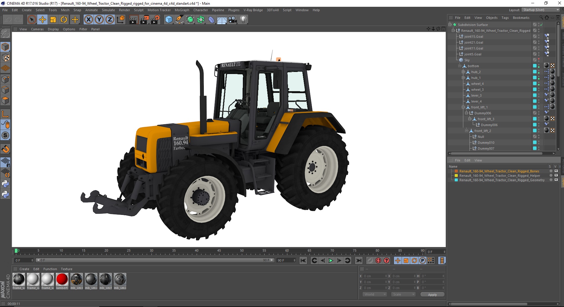 Renault 160-94 Wheel Tractor Clean Rigged for Cinema 4D is fully rigged and is ready to be animated in Cinema 4D. You can easily position it the way you need or animate it the way your project requires. See the screenshots to get an idea of how rigging works. The pose of the model on the render images is an example and can be recreated using rig, it is not initially included into the product.
