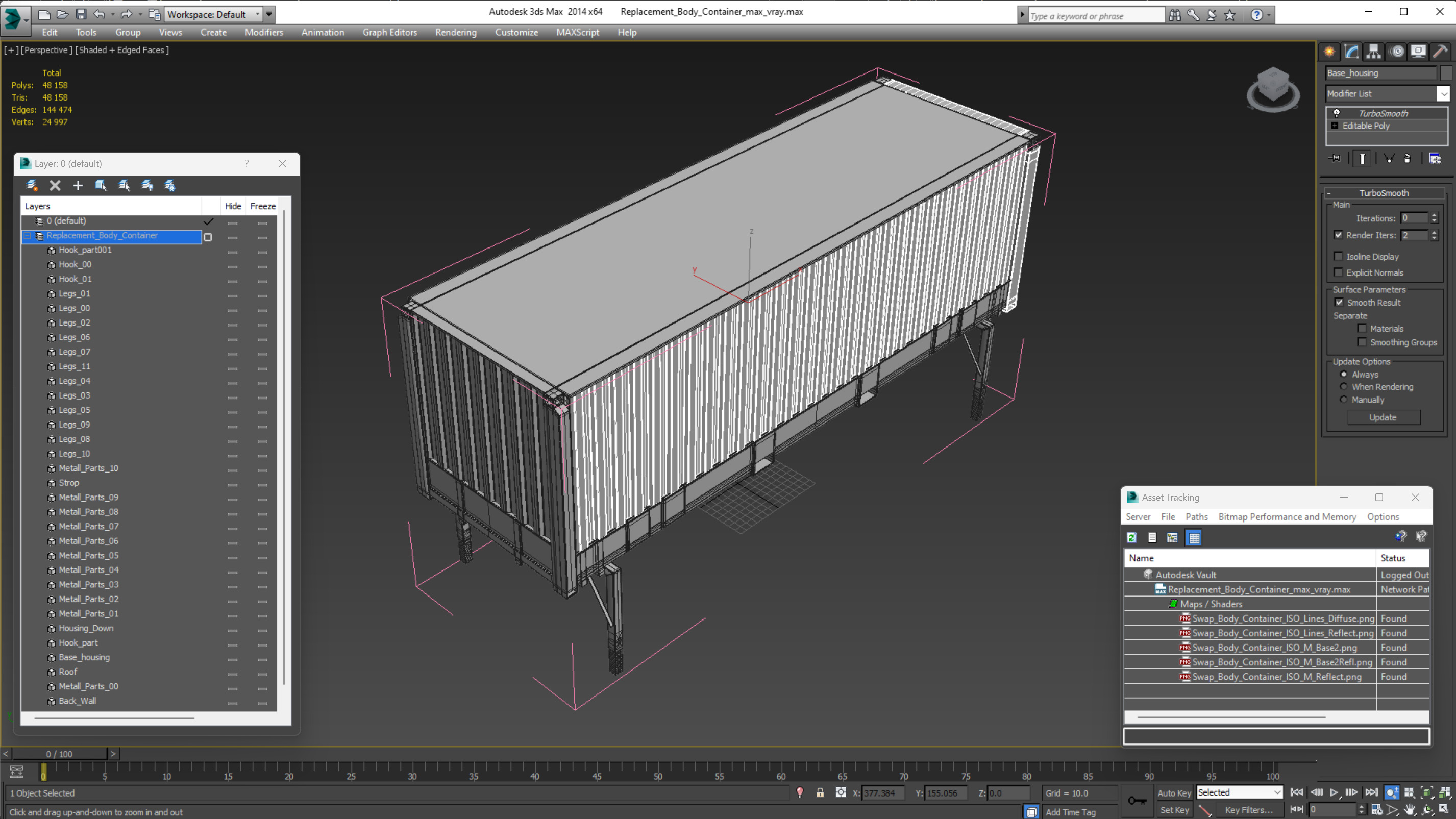 Replacement Body Container is a high quality, photo real 3d model that will enhance detail and realism to any of your rendering projects. The model has a fully textured, detailed design that allows for close-up renders, and was originally modeled in 3ds Max 2020 and rendered with V-Ray. Renders have no postprocessing!