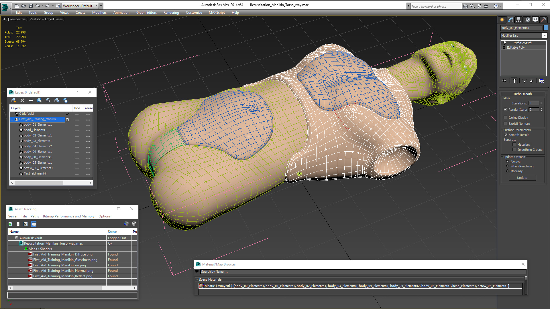 Resuscitation Manikin Torso is a high quality, photo real 3d model that will enhance detail and realism to any of your rendering projects. The model has a fully textured, detailed design that allows for close-up renders, and was originally modeled in 3ds Max 2020 and rendered with V-Ray. Renders have no postprocessing!