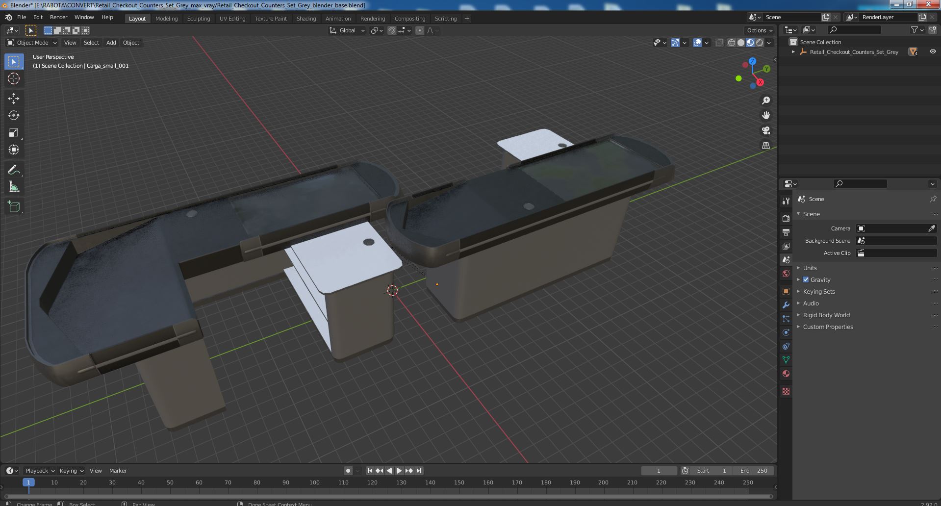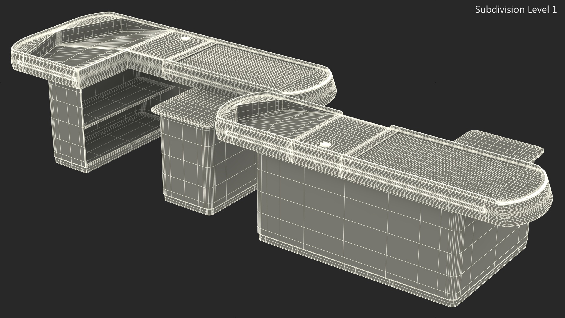 Retail Checkout Counters Set Grey is a three-dimensional model of pair (set) of checkout counters with conveyor belt items which features a contemporary design with an integrated conveyor belt for efficient scanning and bagging of items at retail points of sale.