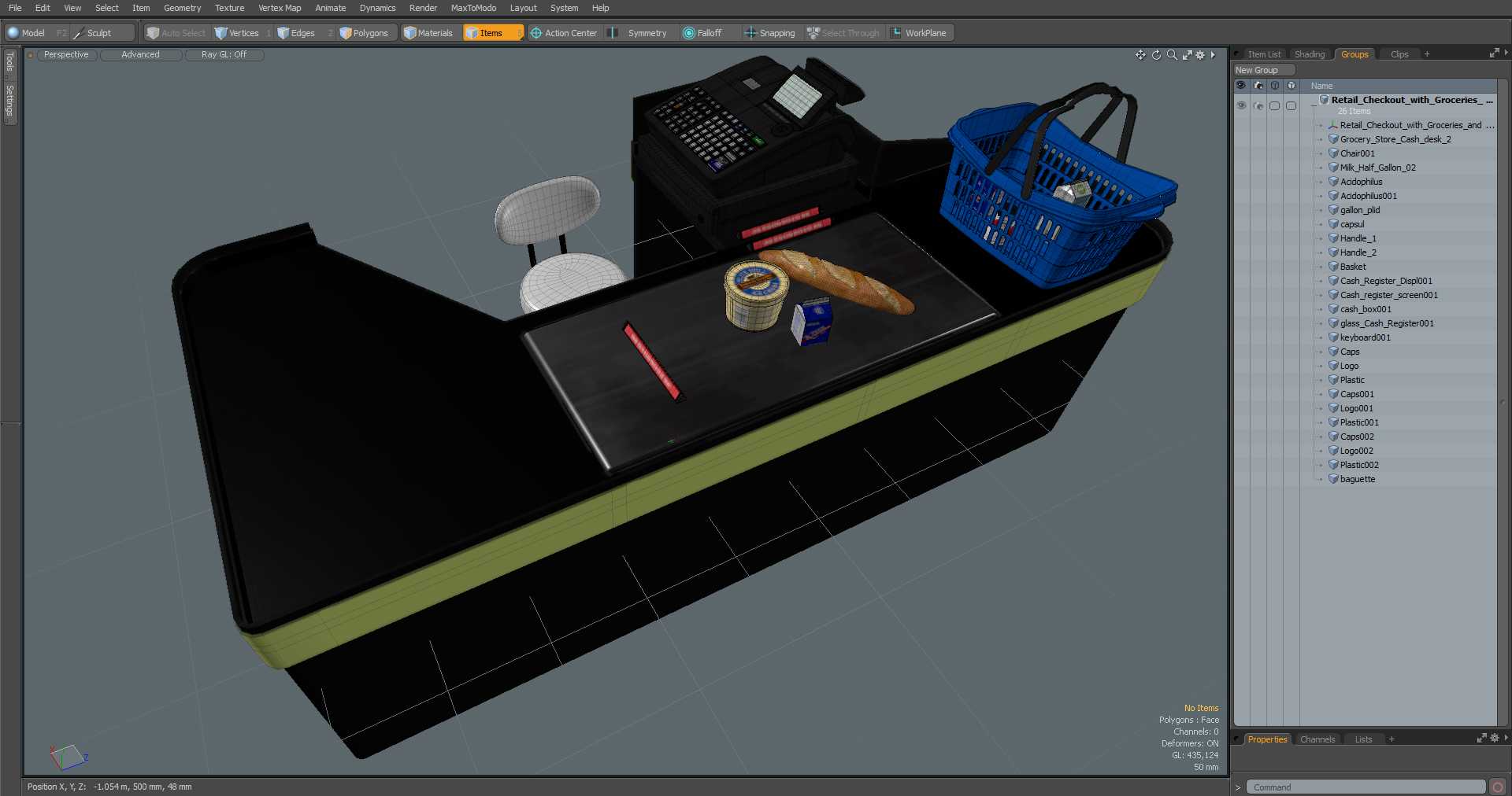 Retail Checkout with Groceries and Divider Bar is a three-dimensional model of checkout counter that features a modern (contemporary) design, and that designed for efficient scanning and bagging of items at retail points of sale.
