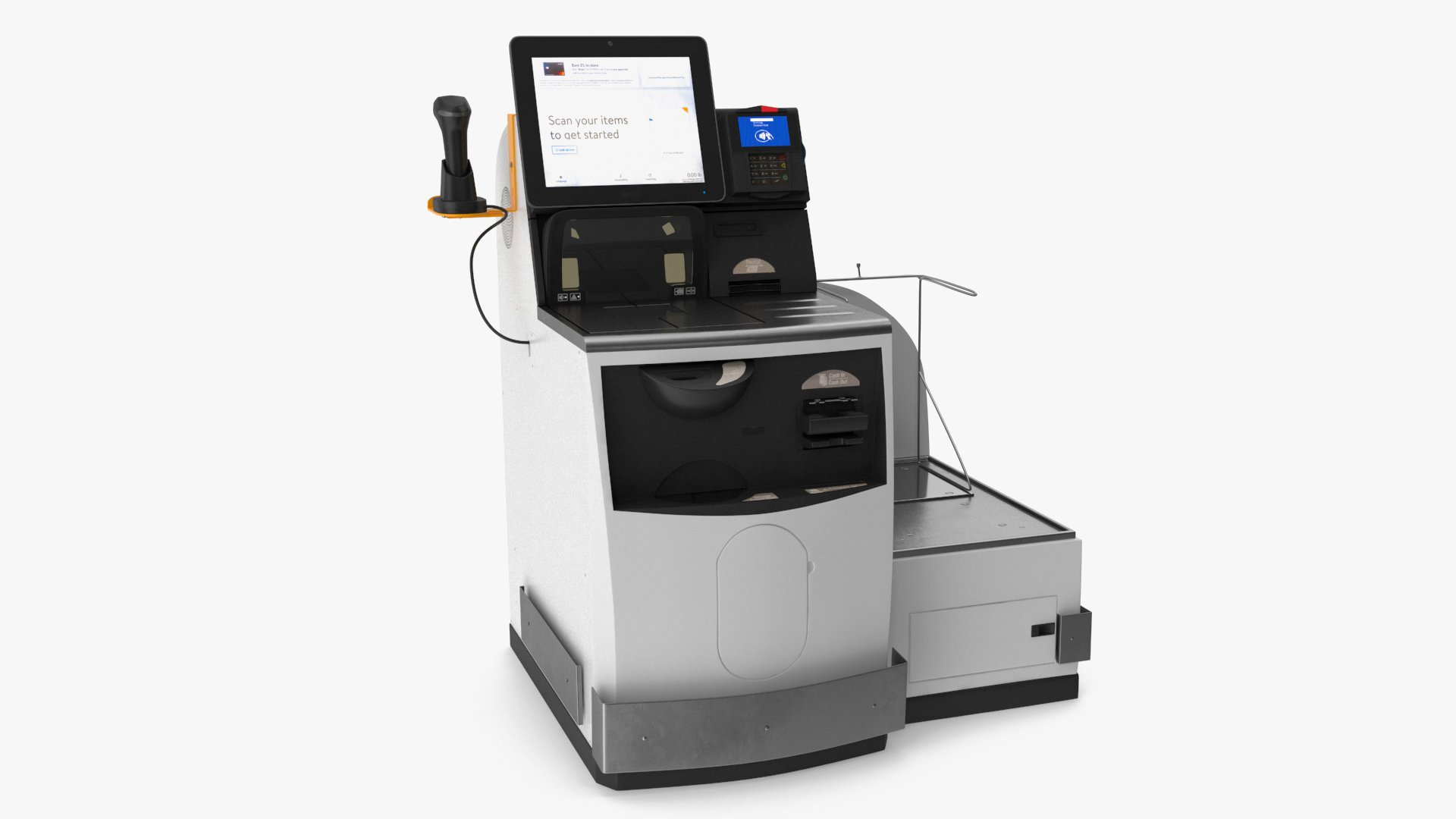 Retail Self Service Checkout Kiosk is a three-dimensional model of self-service checkout kiosk which is a specifically designed automated retail system which allows shoppers to scan, bag, weigh, and pay for their items without the assistance of a cashier.
