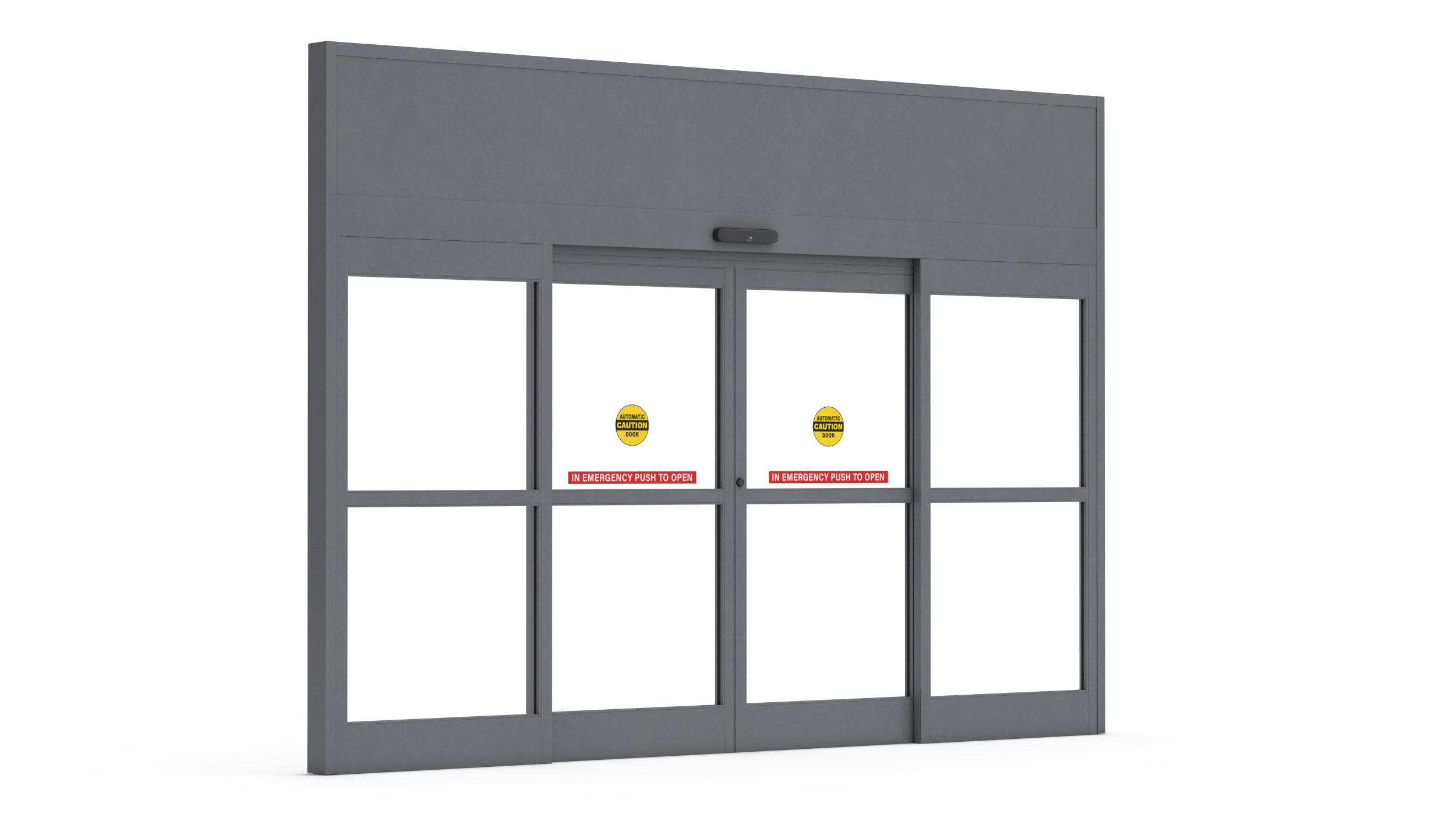 Outside building entrance equipment which designed for pedestrian users and which slide into a space in the parallel wall, and which triggered with use of special approach sensor (the door opens when a user approaches it).