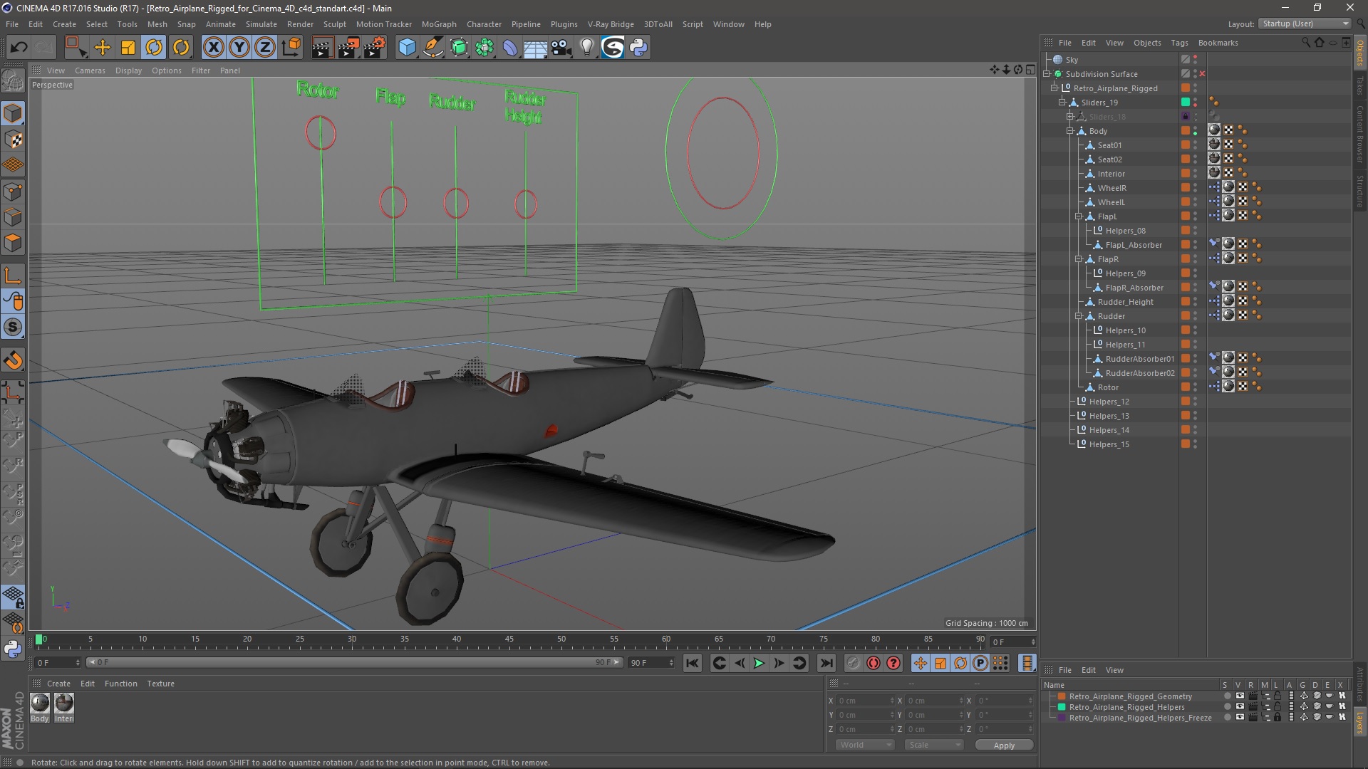 Retro Airplane Rigged for Cinema 4D is fully rigged and is ready to be animated in Cinema 4D. You can easily position it the way you need or animate it the way your project requires. See the screenshots to get an idea of how rigging works. The pose of the model on the render images is an example and can be recreated using rig, it is not initially included into the product.