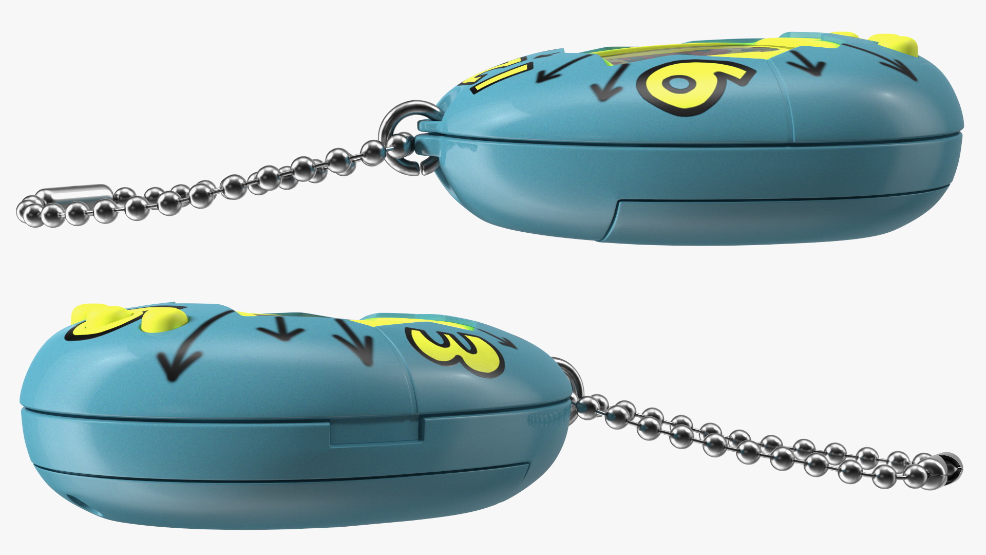Retro Tamagotchi Bandai Yellow-Blue is a three-dimensional model of an old style handheld digital electronic pet toy, which is virtual animal pet creature.
