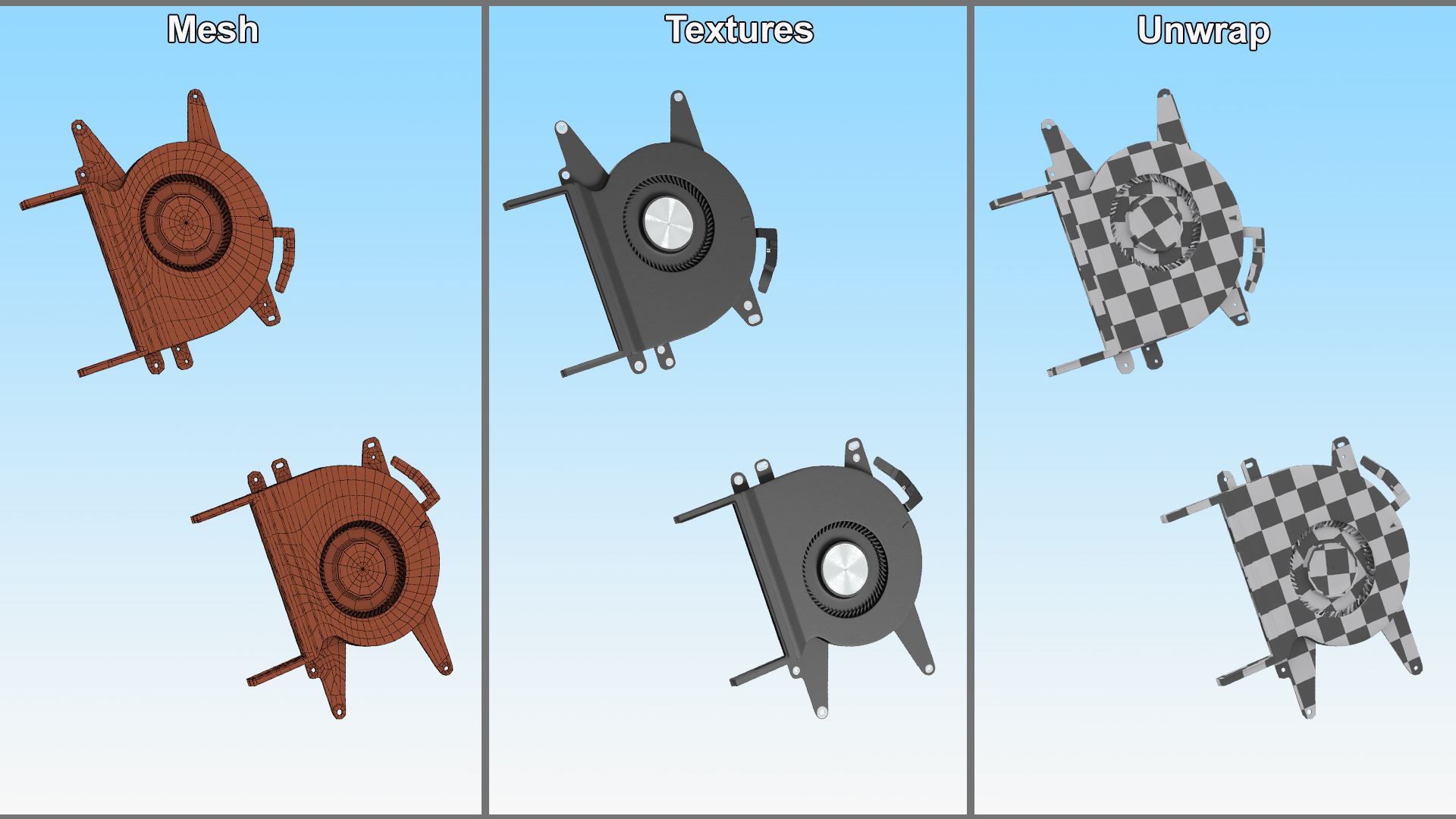 Right and Left Fans of MacBook Pro 14 M2 is a 3d model of cooling devices installed within a laptop computer to regulate its temperature by dissipating heat generated by the internal components.